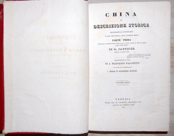 In 8° grande (23,4x14,4 cm); 508 pp. e 72 c. di tav. e una carta geografica più volte ripiegata con territorio della Cina e del Giappone. Bella legatura coeva in mezza pelle rossa con titoli e fregi in oro al dorso. Esemplare in ottime condizioni di conservazione ed ancora in barbe. L'opera uscì nella celebre collana di monografie a se stanti dedicata ognuna ad un paese del mondo pubblicata con il titolo "L'universo o storia e descrizione di tutti i popoli". Probabilmente nell'idea iniziale era quella di pubblicare due parti ma di fatto un secondo volume non uscì mai. Prima edizione italiana. Celebre opera del grande Jean-Pierre Guillaume Pauthier. L'autore, Mamirolle, nato nel 1801 e morto a Passy nel 1873, fu un celeberrimo orientalista francese. Studioso di fama, pubblicò numerosi studi e scritti sull'Oriente (Cina, India .), le Isole Ionie, e compilato molte traduzioni, tra cui Marco Polo e Confucio. Ha anche tradotto il Saggio sulla filosofia degli indù di Henry Thomas Colebrooke. In quest'opera descrive la storia, la geografia ed costumi della Cina. Molto belle le 72 tavole fuori testo. Opera non comune.