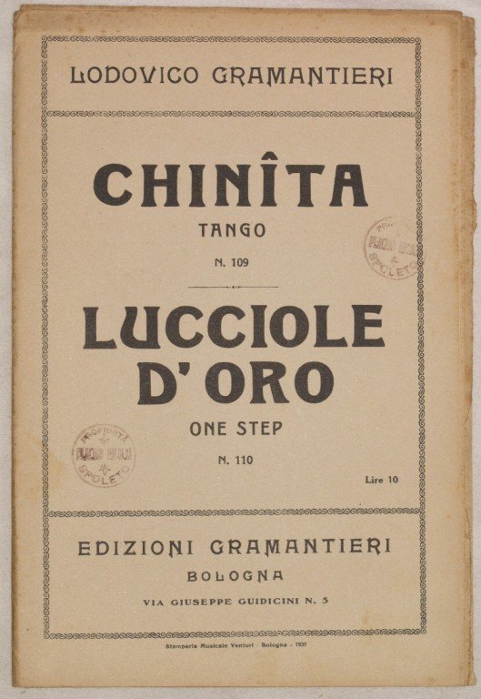 In 8. cm 27x18. pp. 26. partitura completa per orchestra del 1931 di due canzoni. Caratteristica copertina illustrata. Ex libris sulla copertina. buone condizioni; bruniture in copertina. a complete score for orchestra not dated but of 1930's. Carachteristic decorated cover of that period. Ex libris in the cover. good conditions; yellowings in the cover.