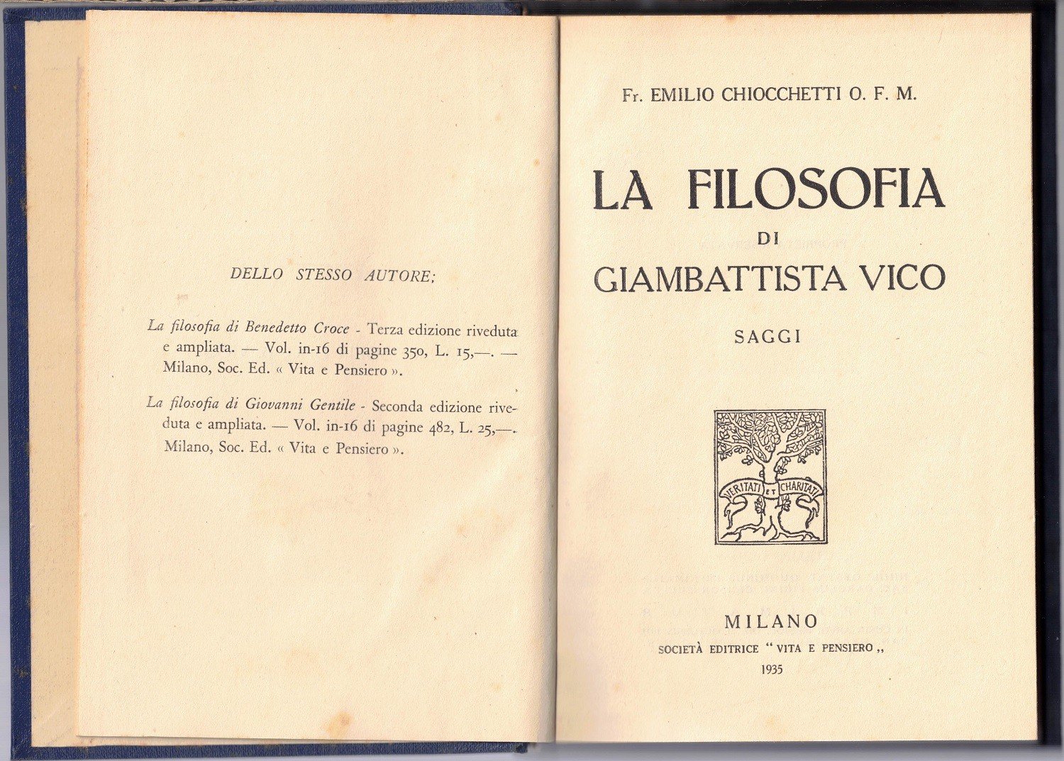 Emilio Chiocchetti, La filosofia di Gianbattista Vico. Saggi, Società editrice Vita e pensiero, Milano 1935, pp. 198, cm 19, legatura in tutta tela blu con titoli al dorso. Minima fessurazione alla cerniera interna del piatto anteriore, ordinari segni del tempo, per il resto esemplare ben conservato, con interni puliti e legatura solida.