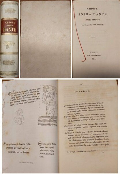 gr. vol. in-4 picc., pp. IX, 899, belliss. leg. coeva in perg. rigida con tass., tit. e fregi oro al d. Segnalibri cons. Risguardi in carta marmorizz. Con 2 tavv. ripiegate di facsimili. Prima edizione delle cosiddette "chiose Vernon" pubblicate dal Barone inglese (1803-1866) come commento di anonimo al poema dantesco, lo "pseudo Boccaccio" una postilla trecentesca della Commedia. Testo molto raro. Splendido esempl. [063]