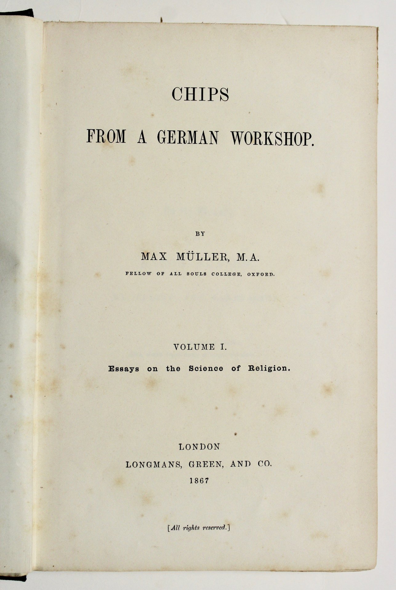 2 voll. In 8°(mm 230x150). Pagg. XXXIII, 377, 24; 356, (4). Percallina verde coeva con titolo in oro al dorso con piccoli fregi alle cuffie, cornice a secco ai piatti, legatura firmata Edmonds & Remnants London. Nel primo volume tratta di scienza della religione; la convinzione dell'autore infatti era che in fondo la religione è un processo, è coscienza dell'infinito, non una rivelazione data agli uomini; Müller mirava ad uno spirito di tolleranza, la sua migliore lezione era: " la religione poteva essere compresa solo attraverso il confronto e la capacità di dissentire". Come disse notoriamente: " chi ne conosce uno, non ne conosce nessuno". Nel secondo volume tratta di temi mitologici, tradizioni e costumi. Secondo la teoria di Müller la mitologia era una malattia del linguaggio, intendendo dire che i miti trasformano i concetti in esseri e storie. Dal suo punto di vista gli dei iniziarono a esistere come parole costruite per esprimere idee astratte, e furono poi trasformati in personalità immaginarie antropomorfizzate. <BR>Bell' esemplare, parzialmente intonso in prima edizione, che presenta lievi fioriture e tracce d'uso alla legatura.<BR>