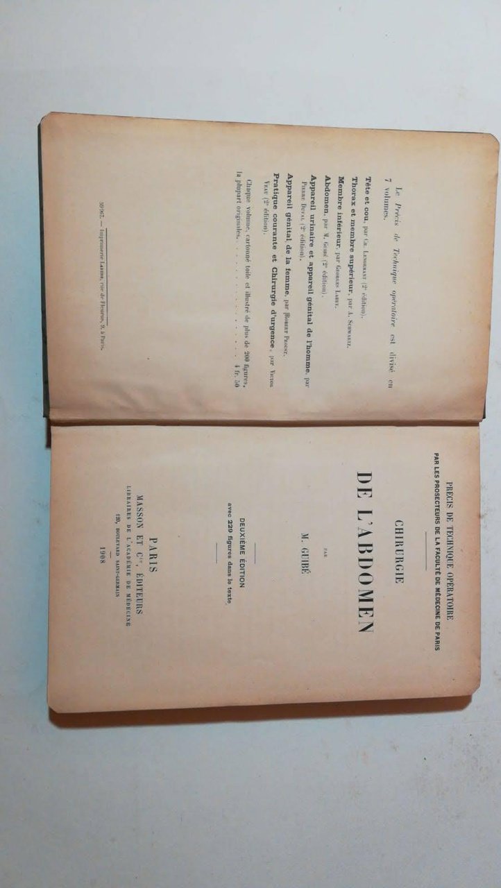 8°, 29 cm, pp. XIX, 255, 229 figure nel testo, rilegatura editoriale in tela, titolo al piatto e dorso, collana: Precis de technique operatoire, testo in francese, esemplare molto buono. *** TUTTI I NOSTRI LIBRI SONO VISIBILI PREVIO CONTATTO MAIL O TELEFONO NELLA NUOVA SEDE DI MILANO: LIBRERIA COSMOPOLIS, VIA JOMMELLI, 22. ***