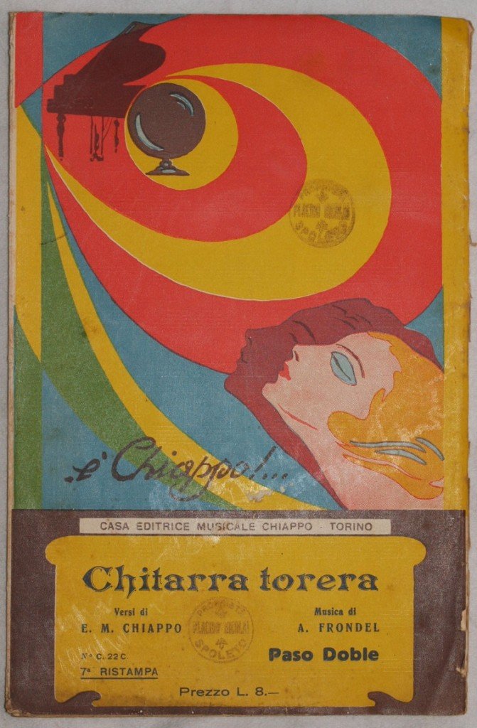 In 8. cm 27x17,5. pp 24. partitura completa per orchestra del 1929 di una canzone.<BR>Caratteristica copertina illustrata d'epoca. ex libris in copertina ed in qualche pagina. In discrete condizioni; piatti in parte staccati e strappo alla prima pagina dello spartito per pianoforte. a complete score for orchestra of 1929. Carachteristic decorated cover of that period. ex libris in the cover and in some pages. In fair conditions; paltes almost detacehd and a tear in the score for piano.