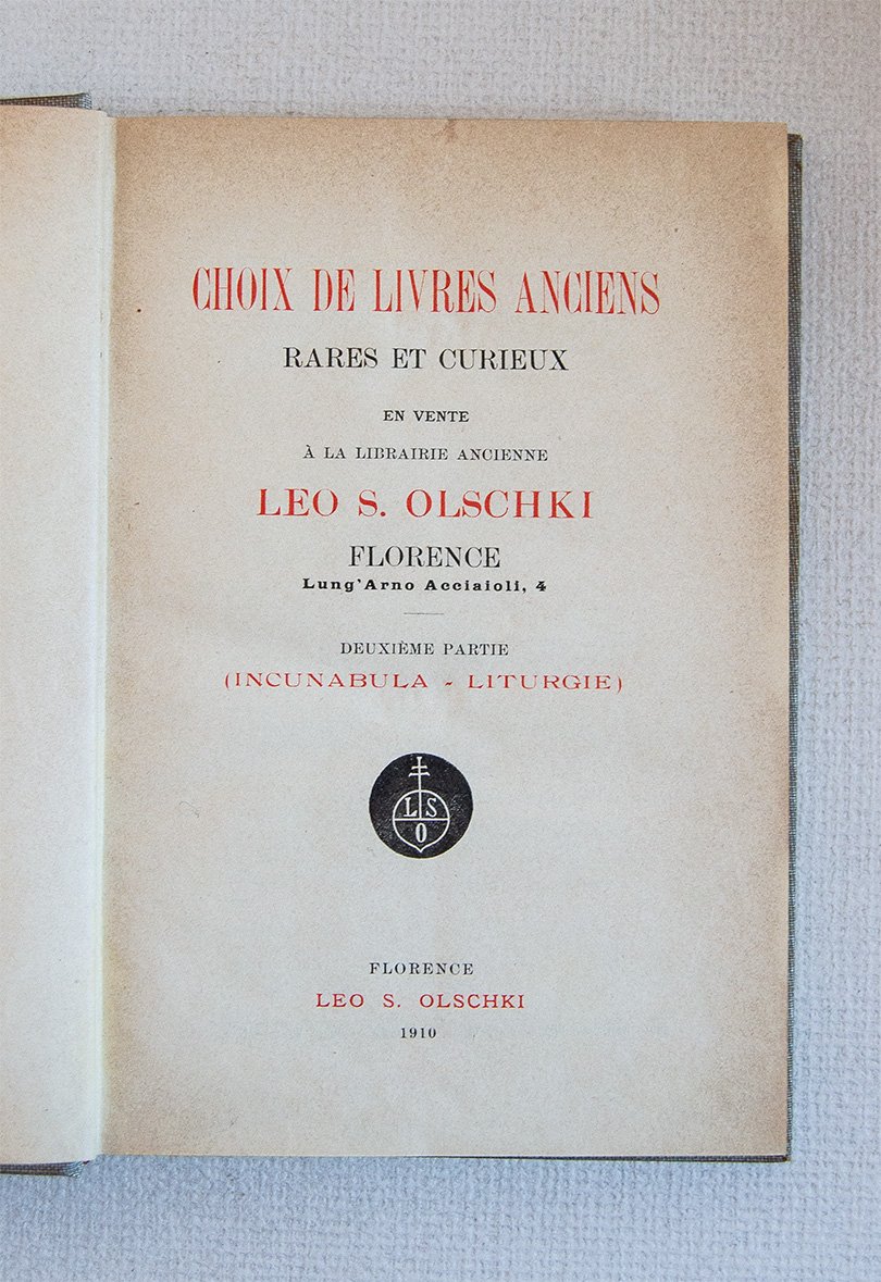 Choix de livres anciens rares et curieux en vente à la Librairie Ancienne Leo S. Olschki Florence. Deuxieme partie (Incunabula - Liturgie).