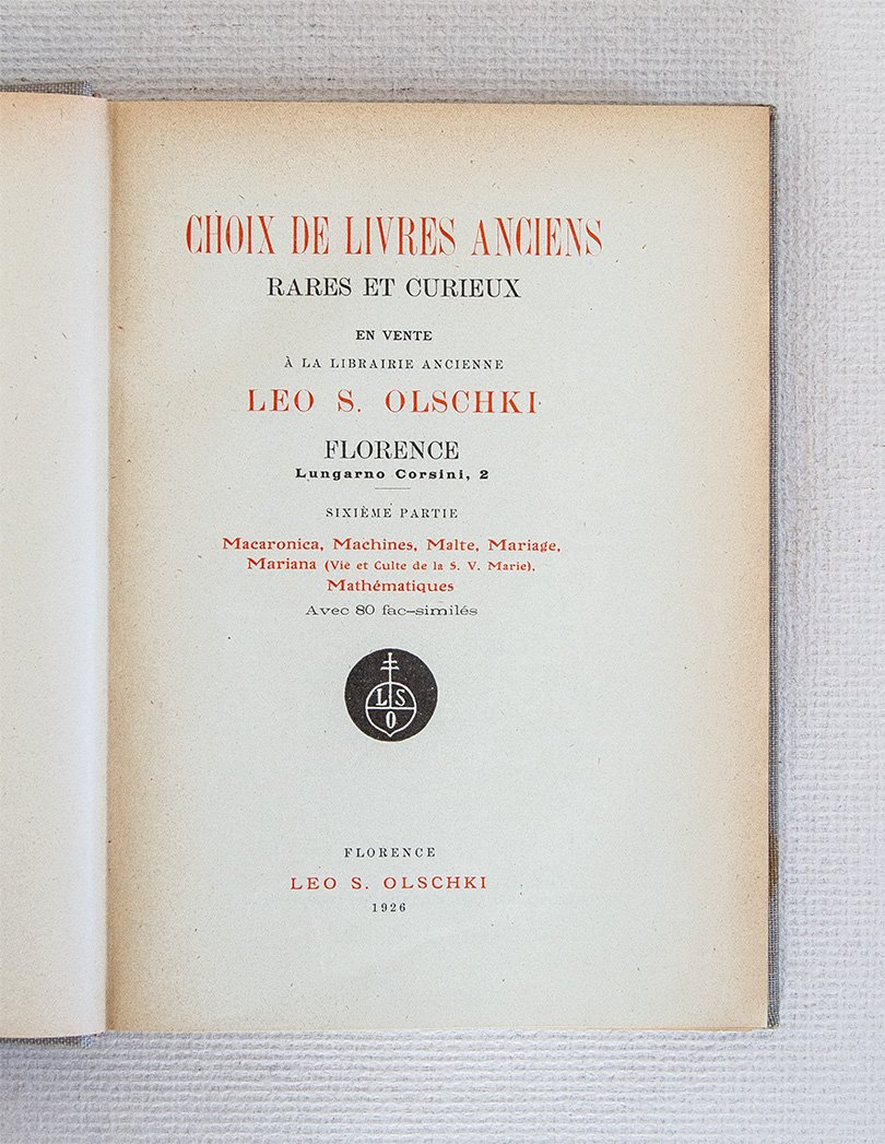 Choix de livres anciens rares et curieux en vente à la Librairie Ancienne Leo S. Olschki Florence. Sixième partie. Macaronica, Machines, Malte, Mariage, Mariana, Mathématique.