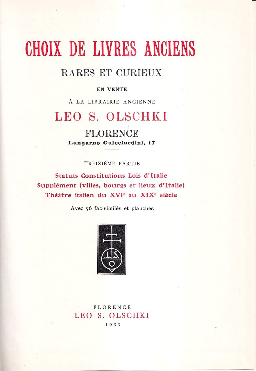 Choix de livres anciens rares et curieux en vente à la librairie ancienne Leo S. Olschki. Trezième partie: Statuts - Constitutions - Lois d'Italie - Théatre italien du XVIe au XIXe siècle (Volume XIII)