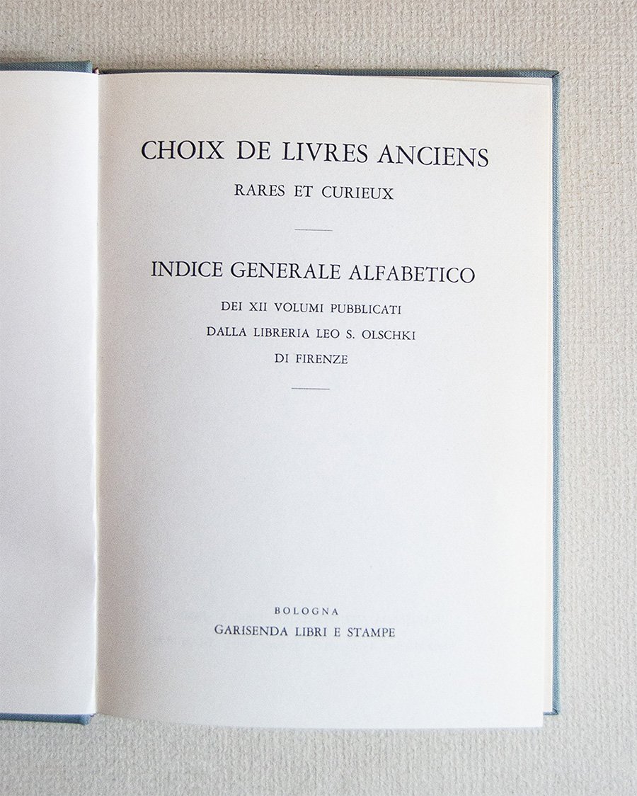 Choix de livres anciens rares et curieux Indice generale alfabetico dei XII volumi pubblicati dalla Libreria Leo S. Olschki d Firenze