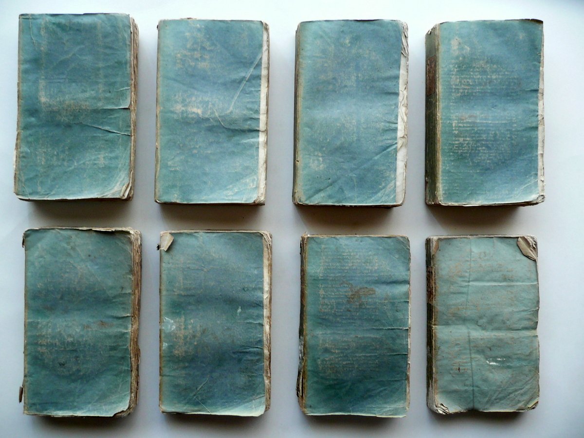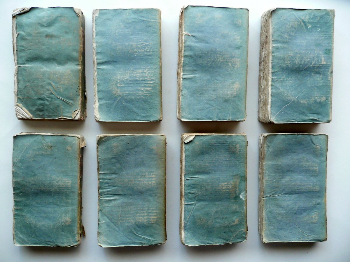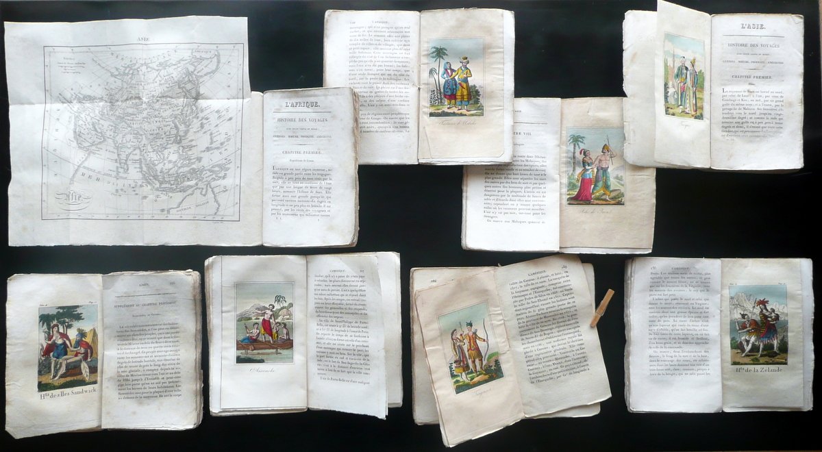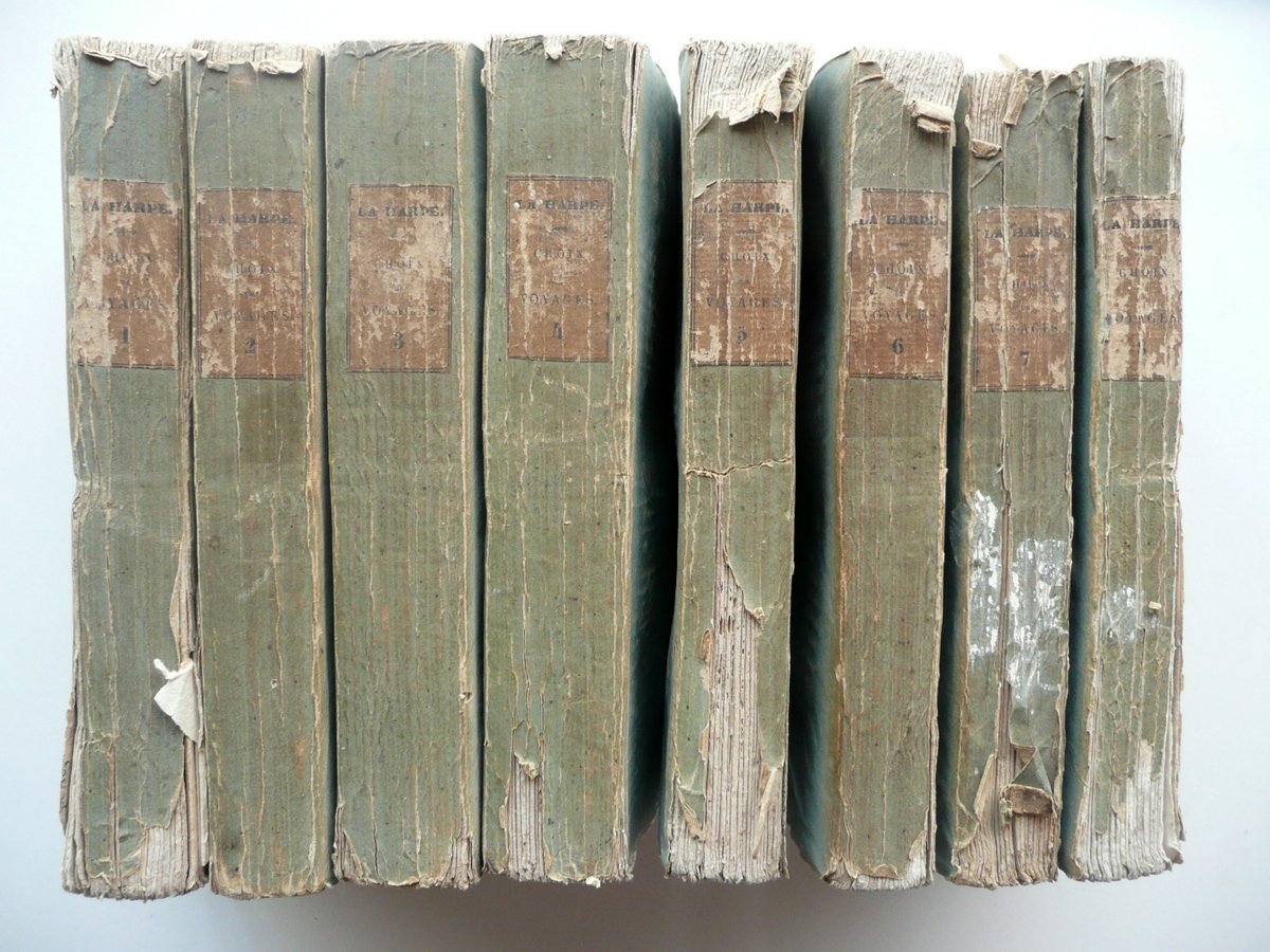 J. F. La Harpe, Choix de Voyages les plus intéressant dans divers parties du monde - 8 volumi / opera completa Chez Philippe Libraire, Paris 1831, cm 18x11, pp. 254 (volume I); 278 (volume II); pp. 348 (volume III); pp. 386 (volume IV); pp. 312 (volume V); pp. 278 (volume VI); pp. 286 (volume VII); pp. 248 (volume VIII), con in totale 23 belle tavole incise a col. fuori testo (colorazione d'epoca a mano) e con una carta dell'Asia incisa in b/n e rip. più volte fuori testo (tale carta è al volume I); brossura d'epoca con titolo e numero del volume entro tassello applicato al dorso. Opera completa in otto volumi. Testo in francese. Condizioni di conservazione Volumi tutti complessivamente ben conservati con tracce d'uso; brossure con alcune irregolarità, leggere abrasioni e qualche lieve alone; margini angoli e dorsi con qualche pieghetta, pochi piccoli strappetti e circoscritte mancanze (queste ultime prevalentemente ai dorsi e alle cuffie dei volumi; vedi foto). Interni buoni con alcune piccole leggere bruniture; cuciture di qualche fascicolo lievemente allentate; angoli di alcune pagine con una pieghetta o traccia di pieghetta; volume VI con una piccola mancanza all'angolo inf. delle pp. 265-266; presenti numerosi errori tipografici nella numerazione delle pagine, ma i volumi sono tutti completi a livello di testo; volume IV mancante di una tavola a colori (vedi sotto). Margini con barbe. Bella e ampia opera di viaggi, completa in otto volumi, purtroppo mancante di una tavola a colori (le tavole presenti sono 23 su un totale di 24; il volume con due tavole è il quarto). Testo in francese. SETT98.L9289.ST7