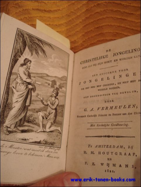 Gebonden, Bound, originele binding destijds, platten in marmer gekleed. titelgravure, 135pp. VERMEULEN (Gijsbertus Antonius), geb. te Utrecht 28 Sept. 1781, overl. te Amersfoort 13 Nov. 1844. Hij volbracht zijne studien te Weert, Megen, Vreden (in het Munstersche) en te 's Heerenberg. In 1804 werd hij priester gewijd en kapelaan te Soest, vervolgens te Amersfoort, en na pastoor te zijn geweest te Uithoorn, werd hij in 1822 als zoodanig benoemd te Amersfoort. 1 Jan. 1833 werd hij aartspriester van het district Utrecht. Hij is de grondlegger van de R.K. armenschool te Amersfoort, van het instituut voor meisjes uit den aanzienlijken stand en van het liefdehuis aldaar. Ook is hij de oprichter (1841) van een blindeninstituut te Laren, dat, naar Eemnes overgebracht in lateren tijd is opgeheven. Tijdens de gevangenschap van Le Sage ten Broek te 's Gravenhage, belastte zich de werkzame man met de redactie van de Godsdienstvriend en andere katholieke tijdschriften. Hij stichtte het tijdschrift De christelijke Mentor, dat slechts twee jaren bestond. Voornamelijk aan Vermeulen had het de kern zijner stukken, gewoonlijk met zijn initialen geteekend, te danken. Hij gaf ook eenige werkjes uit: De maagd, zooals zij zijn moet en worden kan. Een geschenk voor meisjes, die het nog met Christus, en niet met de wereld houden. Uit het Hoogd. (Amst. 1820); Anderen moedigde hij aan, om door geschriften de katholieke Kerk te verdedigen.