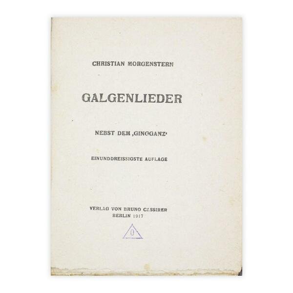 Autore: Christian Morgenstern Titolo: Galgenlieder Sottotitolo: Nebst dem, gingganz - einunddreissigste auflage Edizione: Verlag von Bruno Cassirer 1917 Dimensioni: 18,5x14,5 cm Pagine: 72 Copertina: Rigida Condizioni: Buone come da foto