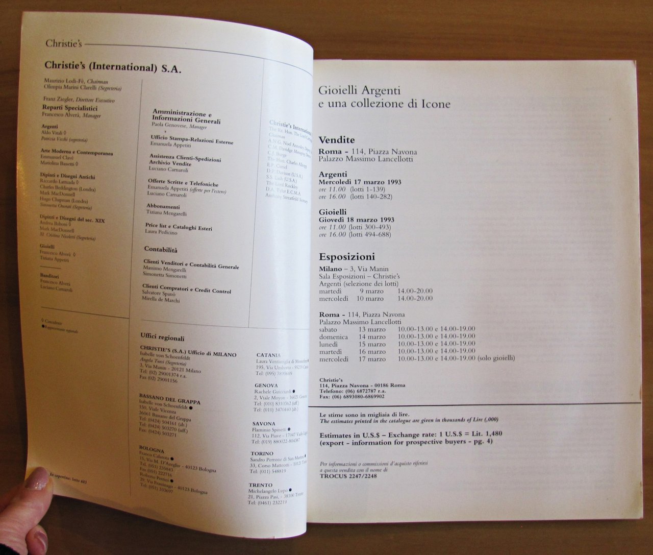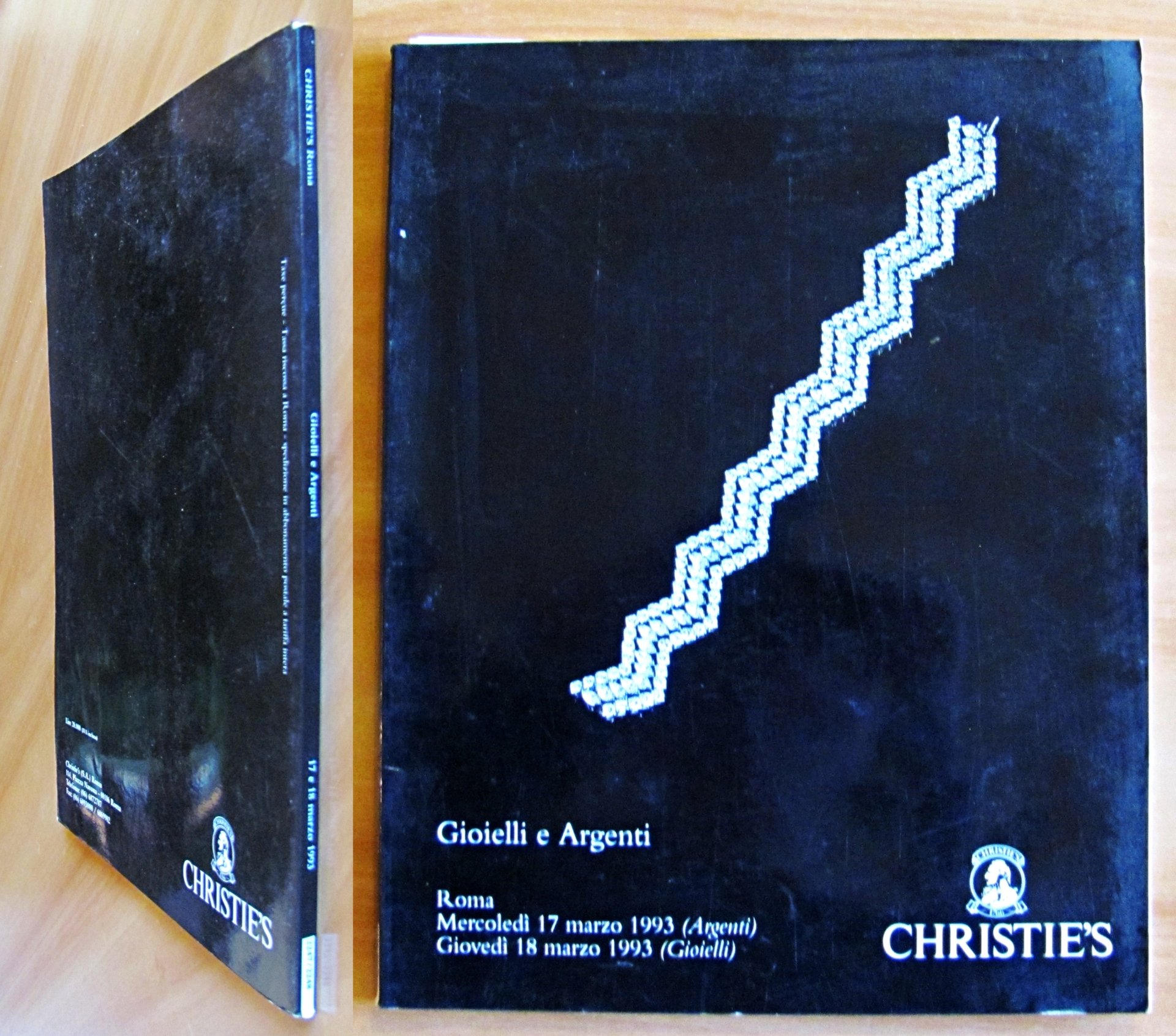 Gioielli Argenti e una collezione di Icone. Christie's - Roma, Mercoledì 17 marzo 1993 (Argenti), Giovedì 18 marzo 1993 (Gioielli). Molte illustrazioni fotografiche in b/n e a colori, a piena pagina, dei lotti in vendita. Ed. Christie's - Roma, 1993. Brossura editoriale. 21x27; pp.88. OTTIMO STATO , Ottimo (Fine)