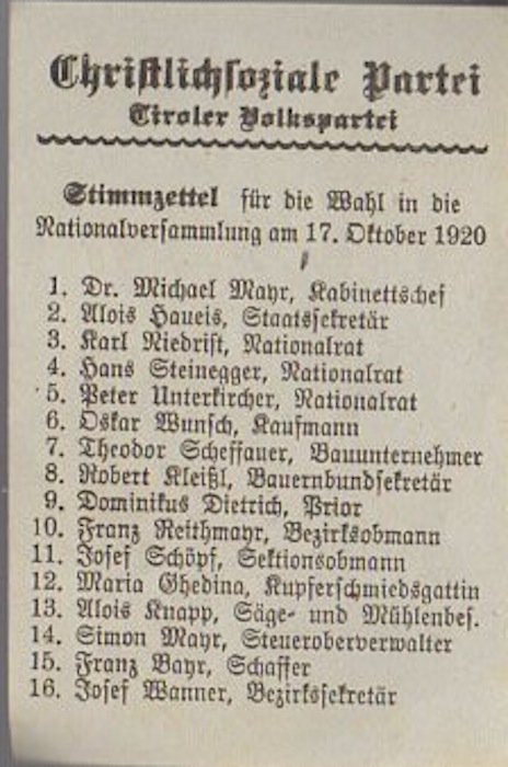 Christlichsoziale Partei: Tiroler Volkspartei. Stimmzettel für die Wahl in die Nationalversammlung am 17. Oktober 1920.