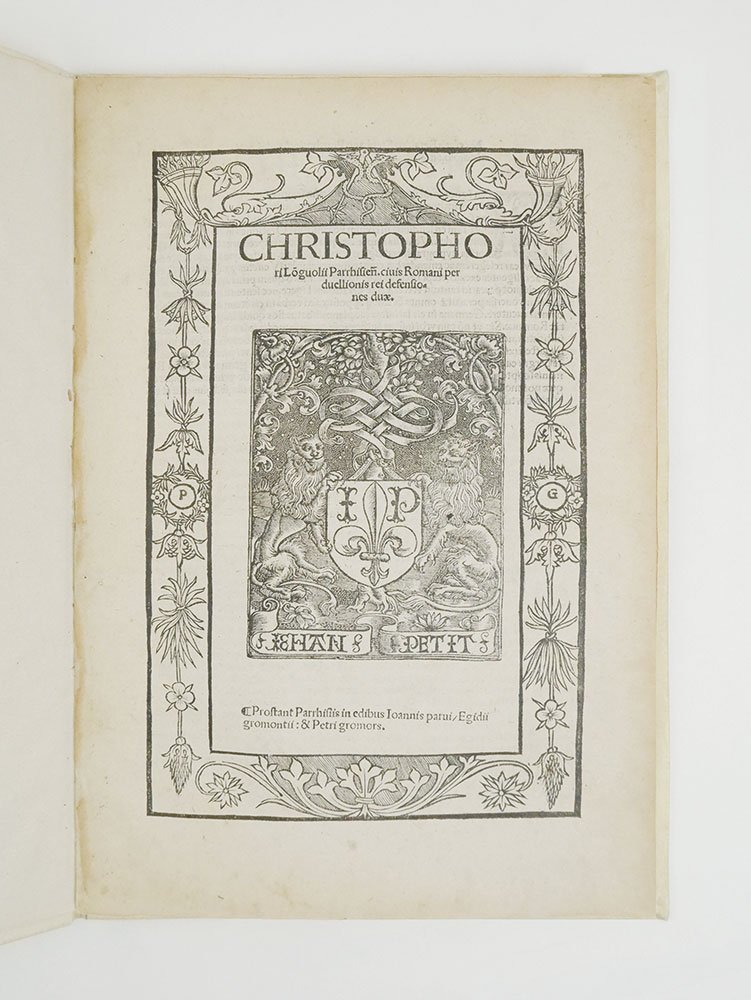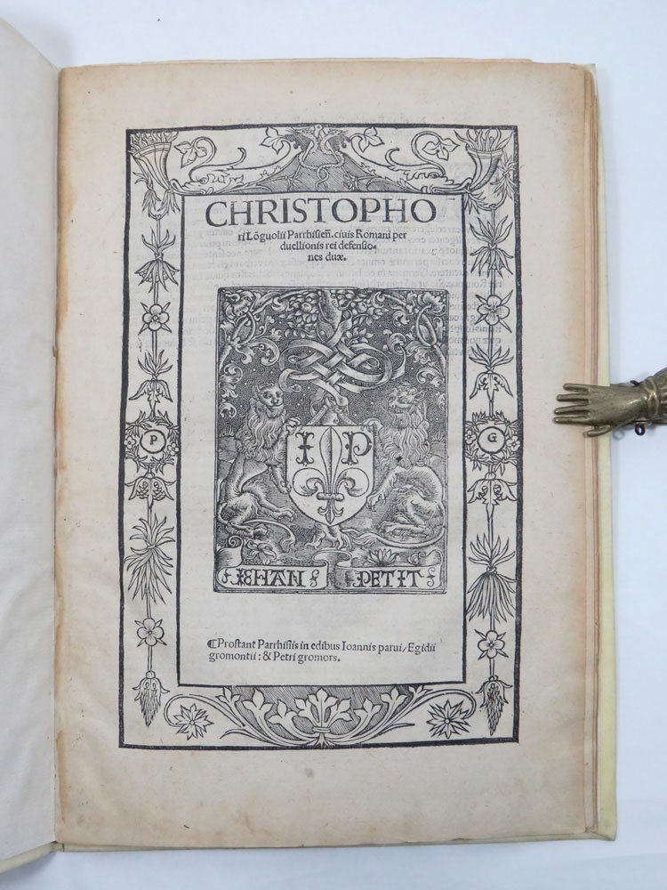 - cc. 20; bellissima marca tipografica di Jean Petit al frontespizio, in ricca cornice a motivi floreali.