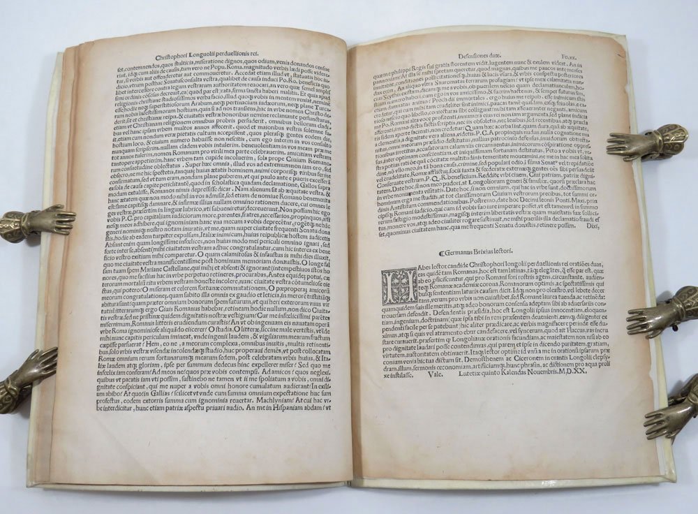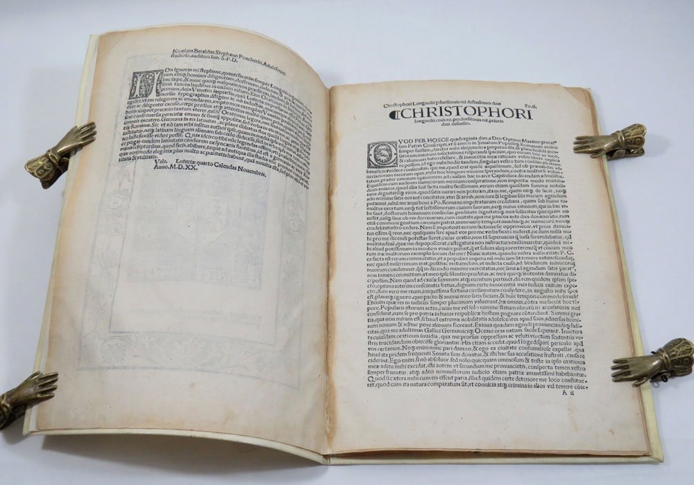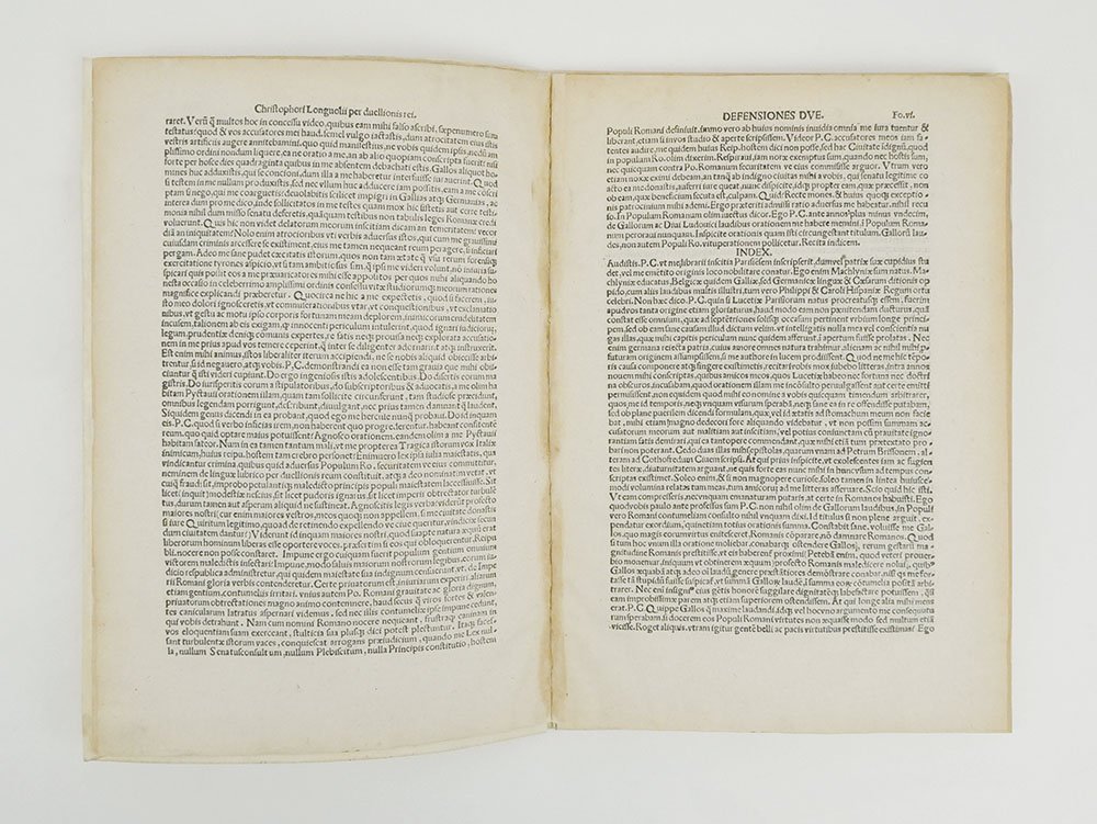 LIBROTerza edizione.Ottimo esemplare.Rarissima terza edizione, dopo la prima di Manuzio (senza data, ma attribuita all'anno 1518 o 1519), e la seconda, impressa a Roma “per magistrum Stephanum Guillereti de Lothoringia” nel 1519. Si tratta della prima stampata in territorio francese: il Catalogue Collectif de France (CCfr) ne censisce un solo esemplare alla biblioteca di Toulouse (nessuna copia in Opac Sbn). -- Cristoforo Longolio, umanista francescano e strenuo difensore dello stile ciceroniano, arrivò a Roma nel 1516 e nel 1519 ottenne la cittadinanza onoraria anche grazie all’intercessione di Pietro Bembo. Contro di lui si scagliarono però molti detrattori, capitanati dal giovane Celso Mellini, che gli rinfacciavano la composizione dell’orazione «In laudibus Francorum» recitata a Poitiers nel 1508, nella quale sosteneva l’inferiorità di Roma verso la Francia. Ma dietro a tutto ciò si celava in realtà «una più sostanziale presa di posizione del Mellini e dei letterati romani dinanzi all’affermazione di un agguerrito umanesimo d’Oltralpe, di cui Longolio, intransigente cultore del magistero ciceroniano, apparve come l’indesiderata avanguardia presso coloro che si consideravano i legittimi depositari dell’eredità classica» (S. Benedetti, «Dizionario Biografico degli Italiani», vol. 73, 2009, s.v. «Mellini, Celso»). -- Nell'Agosto del 1518 Longolio scrisse dunque queste due celebri orazioni che innalzavano Roma, per discolparsi dall’accusa di delitto contro lo stato (perduellio). Ogni sforzo, però, fu vano: la campagna diffamatoria fu talmente travolgente che Longolio dovette abbandonare la città per rifugiarsi prima a Venezia e poi a Padova, dove morì nel 1522, a soli 32 anni.