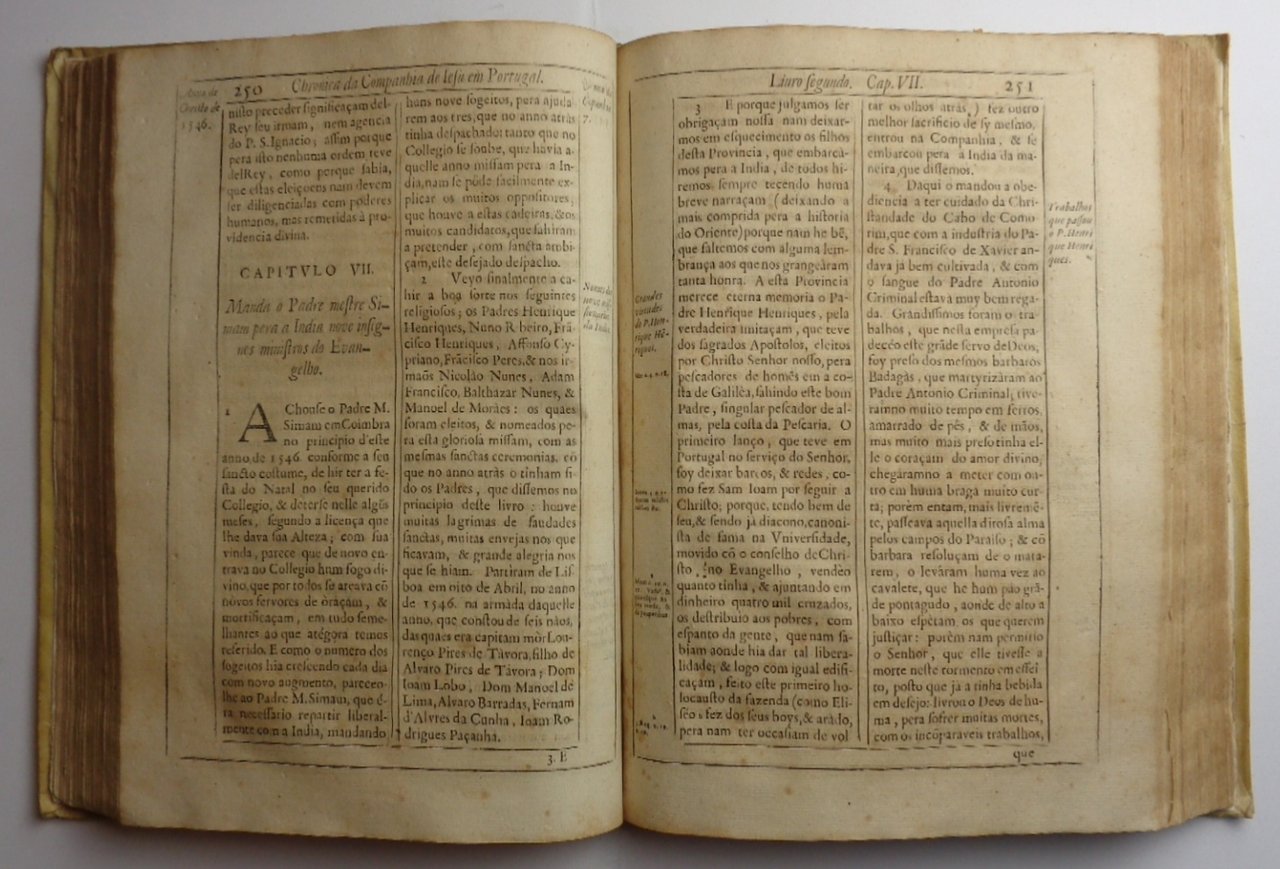 Due volumi in folio (22x31 cm), legatura cova in tutta pergamena, titolo manoscritto al dorso. Risguardie rimesse al volume primo. In entrambi i volumi il frontespizio tipografico è preceduto da un frontespizio calcografico con stemma dei reali di Portogallo inciso da Grégoire Huret. Paginazione vol.1: (24)-709 [i.e. 711). Ripetute nella numerazione le p. 663-664. Volume 2: Segunda parte, na qual se contem as vidas de alg?s religiosos mais assinalados, que na mesma provincia entràram, nos annos em que viveo S. Ignacio de Loyola, . Paginazione: (16)-1-232-(4 con la numerazione 232¹/?)-233-904 pagine. Erosione restaurata all'angolo dei titoli. Qualche brunitura sparsa, come sempre in questo tipo di carta, ma ottime condizioni di stampa e larghi margini. Raro da trovarsi, completo dei due frontespizi calcografici e delle pagine extra nel secondo volume. Oltre alle vicende dei Gesuiti in Portogallo, nei due volumi sono contenute cronache delle missioni in Brasile, India, Africa (Angola, Etiopia, Congo), Giappone. "This work is a classic for the information it gives about the first Jesuits in Brazil, and is very rare. Absolutely complete copies, with the two frontispieces and the supplementary chapter 51 [as in this copy], are very rare" (Borba de Moraes).