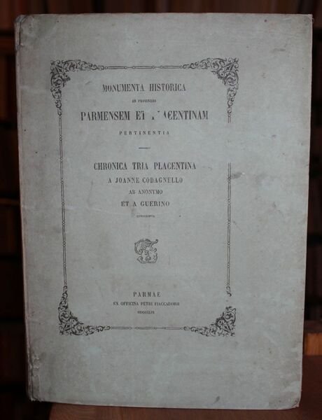 In 4° grande (cm 33,5 x 24,5), pp. XXXIV, (2), 442, (2). Cartonatura editoriale a stampa, a fondo verde. Leg. con qualche difetto e alcune abrasioni sul primo piatto che toccano leggermente i titoli a stampa. Qualche fioritura ma nel complesso buona copia, a fogli chiusi. Della serie: Monumenta historica ad provincias Parmensem et Placentinam pertinentia.