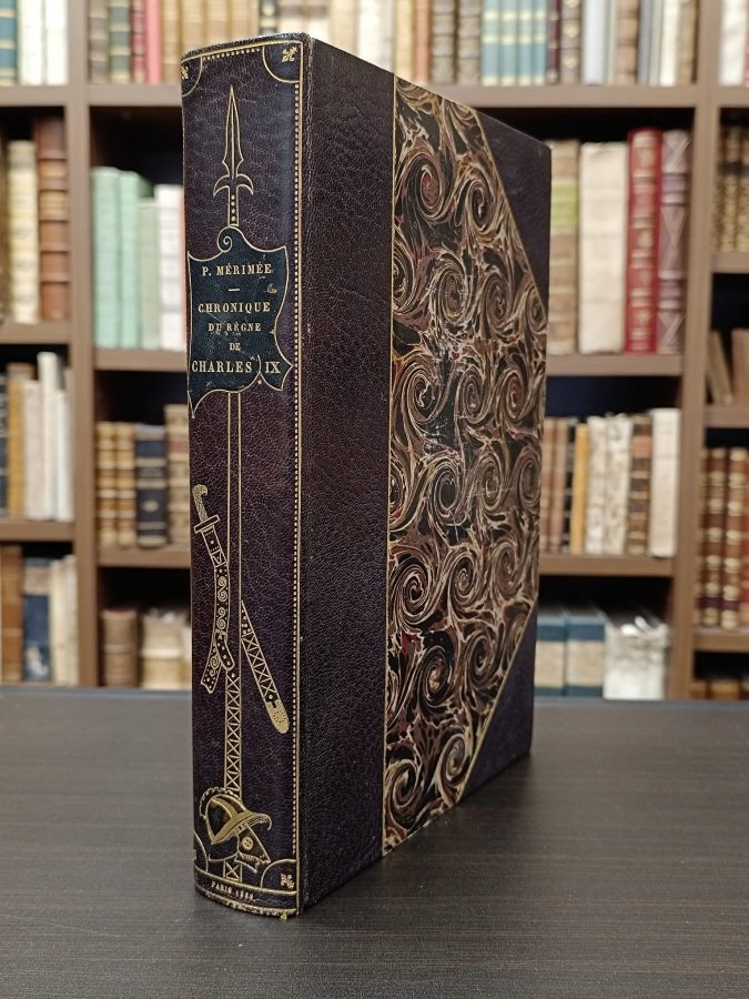 <span style="font-style: normal;">In-4° (cm. 28,1), bella legatura suggestiva coeva in mezza pelle nera ad angoli, dorso liscio figurato con armi impresse in oro e ad intarsi, titolo in oro su intarsio verde, il tutto inquadrato da filetti in oro ornati agli angoli, piatti e risguardi marmorizzati, taglio superiore dorato; conservata la brossura editoriale a stampa illustrata e con titoli in rosso e nero; pp. XV [1b] XV [1] 322 [2] in buono stato (alcune fioriture); con 110 composizioni nel testo di Edouard Toudouze e 8 tavole sempre dell'artista <span style="font-size: 13.333333px;">incise all'acquaforte da Eugène Abot </span>fuori testo apparse solo nel 1890. Presenti 2 frontespizi: il primo in rosso e nero (1889) con prefazione originale; il secondo in nero (1890) con prefazione di Francisque Sarcey. Cfr. Vicaire V, 708; Monod 8072. </span><i>Ex Libris</i> araldico applicato al contropiatto. Esemplare molto buono. (NJ4)