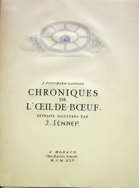 Edition Raoul Solar, Monaco, 1966. Grand in/4 en feuilles, couverture rempliée, sous chemise cartonnée et étui, illustrations in-texte de Sennep au pochoir, 309 pages. Exemplaire numéroté sur papier pu fil à la forme Johannot. Extrait des chroniques de l’oeil de boeuf. Jean-Jacques Charles Pennès, dit Jean Sennep ou Jehan Sennep, né à Paris le 3 juin 1894 et mort à Saint-Germain-en-Laye en 1982, dessinateur de presse et caricaturiste français. Il est considéré comme un des plus grands illustrateurs de la presse française. Homme de droite ayant toujours clairement affiché son anti-communisme dans ses dessins, il a collaboré à de nombreux journaux, dont Candide et Le Figaro. Il a illustré plusieurs pamphlets antirépublicains de Léon Daudet (de l'Action française) au début des années 1930. Les caricatures de Léon Blum qu'il dessine à cette époque sont particulièrement connues. Cependant, lorsque Cabrol, dessinateur communiste, est attaqué par Hitler en raison d'une caricature parue dans un journal luxembourgeois, il soutient son confrère. En 1941, il se rallie à De Gaulle. Il a influencé beaucoup de caricaturistes, notamment Jean Effel et Jacques Faizant. Il participe brièvement au Canard enchaîné à la Libération. Jusqu'à son départ en retraite, en 1967, il est le dessinateur attitré du Figaro. Pendant plusieurs années et au moins jusqu'à la fin des années 1970, l'hebdomadaire Point de Vue - Images du Monde publie dans chaque numéro une caricature de Sennep.