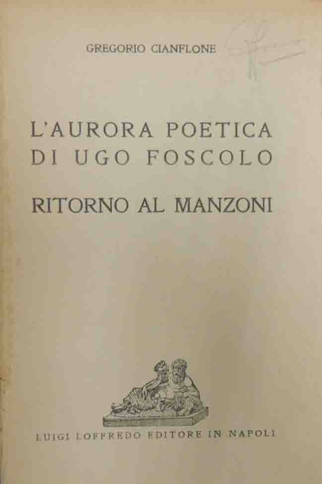 Gregorio Cianflone, L’aurora poetica di Ugo Foscolo. Ritorno al Manzoni, Luigi Loffredo Editore, Napoli s.d. (1947?), pp. 97, cm 21, br. ed. Firma d’appartenenza alla prima di copertina e alla prima carta. Lievissime tracce d’uso alla brossura, minime bruniture, per il resto ben conservato.