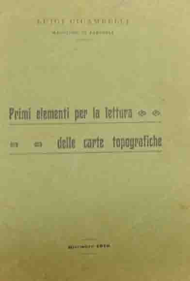 Luigi Cicambelli, Primi elementi per la lettura delle carte topografiche, s.n., s.l. 1916, pp. 32, ill. b.n., 1 c. di tavv. f.t. ripiegata ill. b.n., cm 16, opuscolo spillato. Edizione fuori commercio. Alla prima pagina: Timbro “III Armata - Reparto Allievi Ufficiali - 2 Compagnia”. Tracce d’uso alla copertina, qualche segnetto a lapis, per il resto interno ben conservato. Raro.