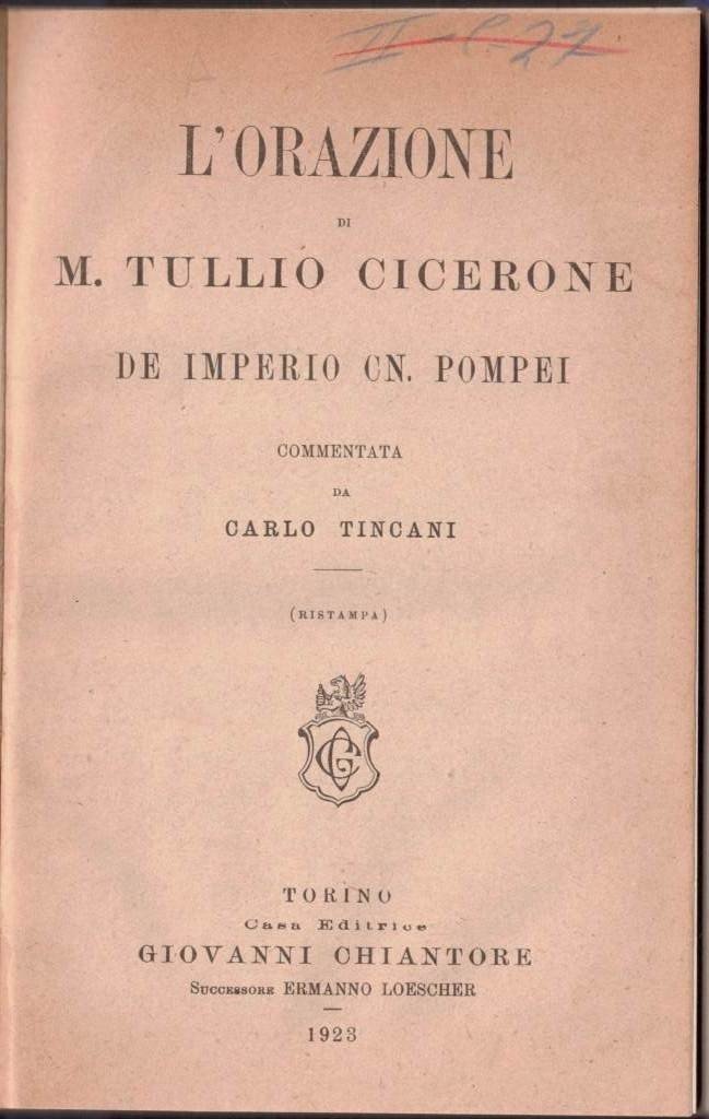 L’orazione di M. Tullio Cicerone De Imperio Cn. Pompei, commentata da Carlo Tincani, Casa Editrice Giovanni Chiantore Successore Ermanno Loescher, Torino 1923, pp. XLV, 96, cm 20, legatura coeva in mezza tela blu con titoli in oro al dorso e angoli. Testo in lingua latina con introduzione, commenti e apparati in lingua italiana. Titolo originale: De imperio Cn. Pompei ad quirites. Titolo alternativo: Pro lege Manilia. Segnatura di collocazione al frontespizio. Minime fioriture, leggera brunitura della carta, per il resto perfetto, con interno pulito e ben tenuto e legatura solida.