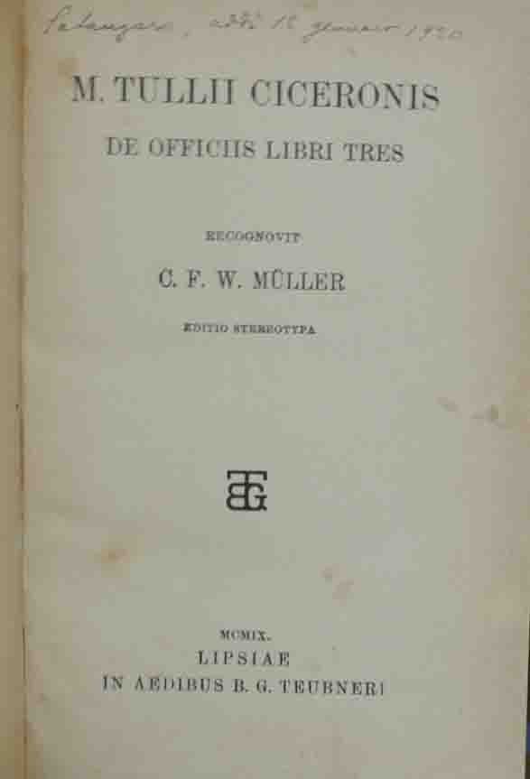 Marco Tullio Cicerone, De officiis libri tres, recognovit C. F. W. Muller, B. G. Teubneri, Lipsiae 1909, editio stereotipa, pp. 130, cm 17, legatura in mezza tela con titoli in oro al dorso. Firma d’appartenenza, luogo e data al frontespizio. Lievi fioriture, leggera brunitura della carta, minima fessurazione della cerniera interna del piatto anteriore, per il resto ben conservato.