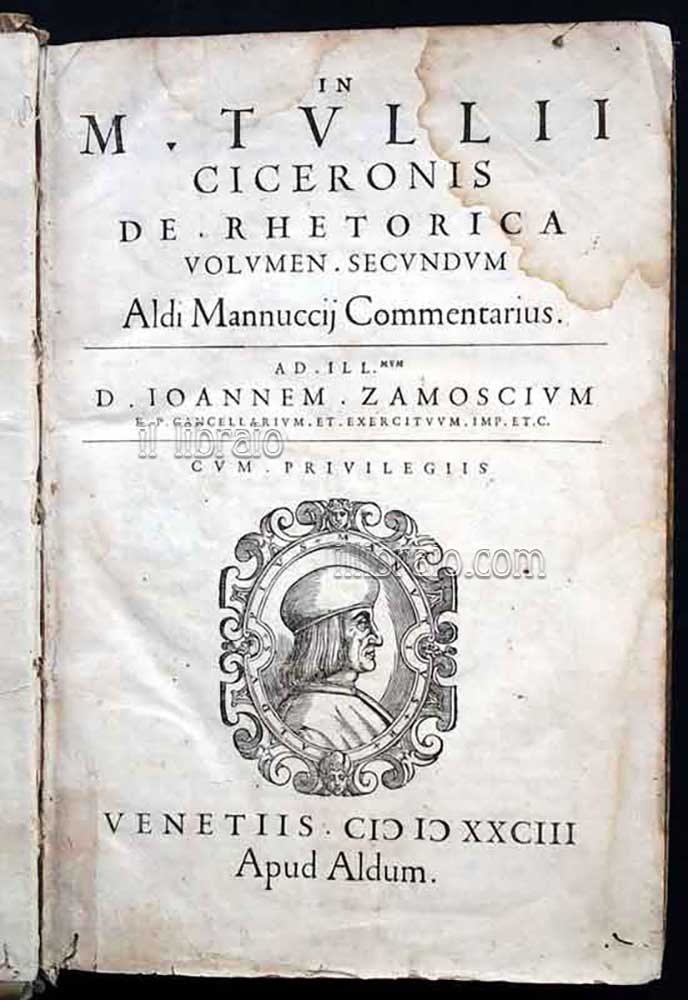 in 4° (32 x 22 cm. ca.); pp. (14) 380 (50); leg. originale in piena pergamena con nervi. Frontespizio con ritratto di Aldo Manuzio, capilettera ed eleganti fregi xilograf. Volume appartenente all’opera omnia di Cicerone dal titolo: M. Tullius Cicero Manucciorum commentariis illustratus antiquaeq. lectioni restitutus. . composta da 10 voll. (Leggeri aloni di umidità e rari segni di tarlo, ormai estinto, su alcune pagine)