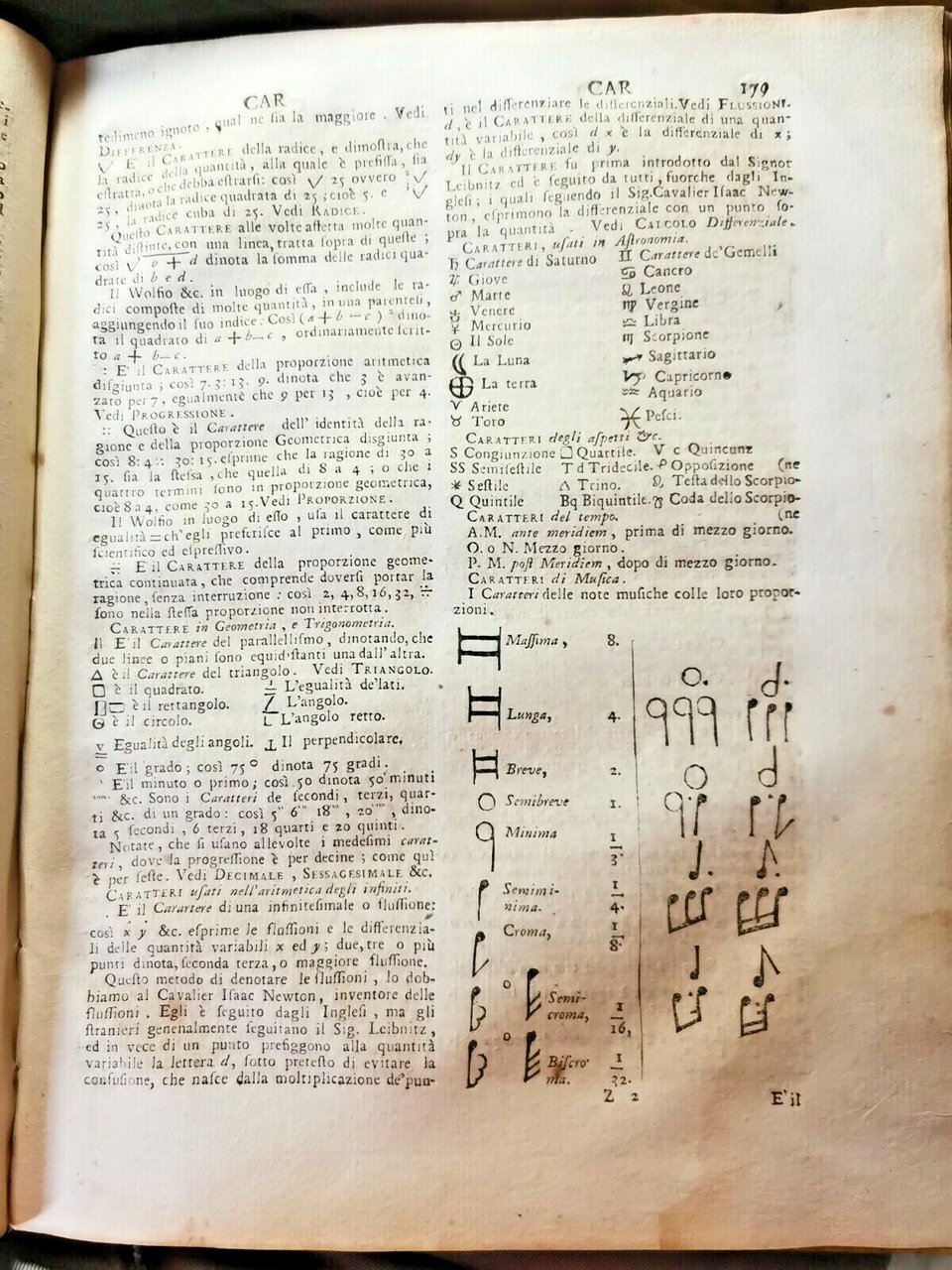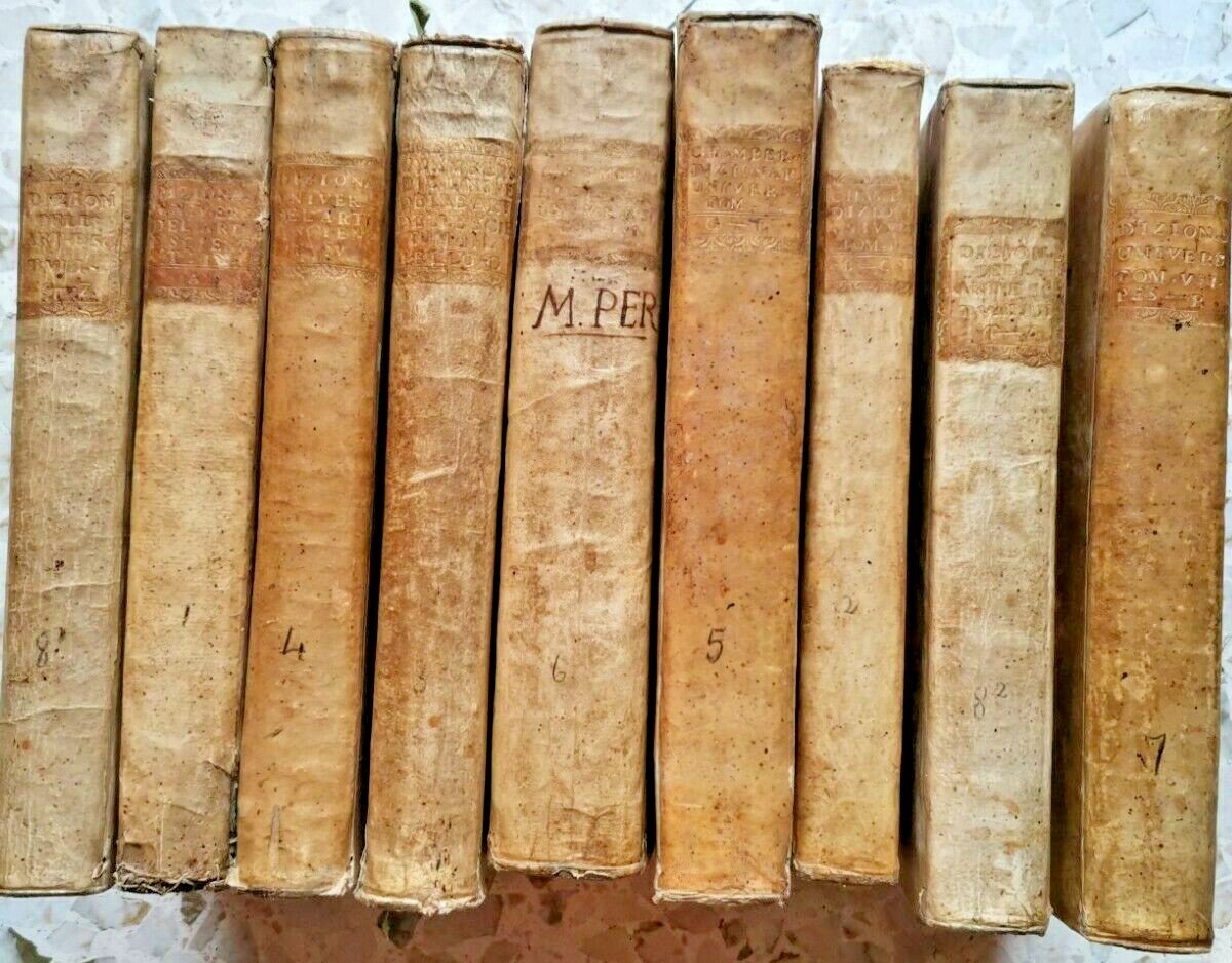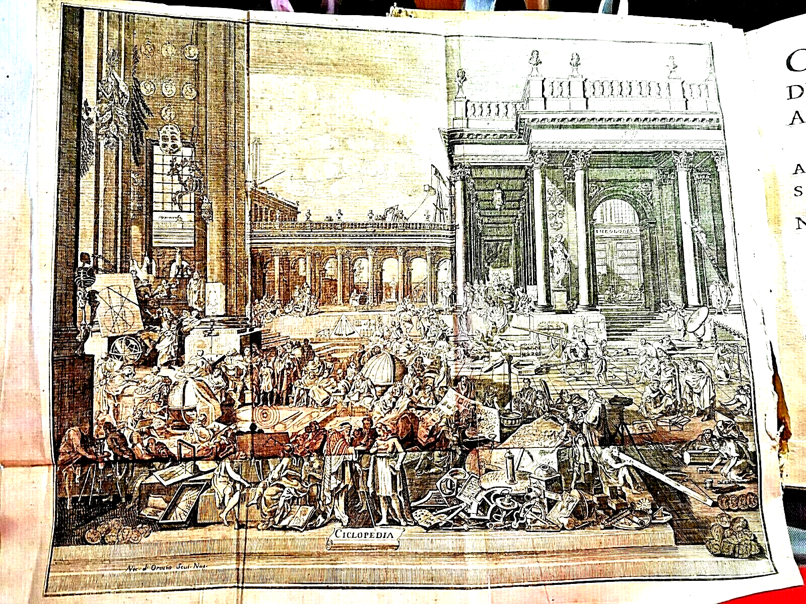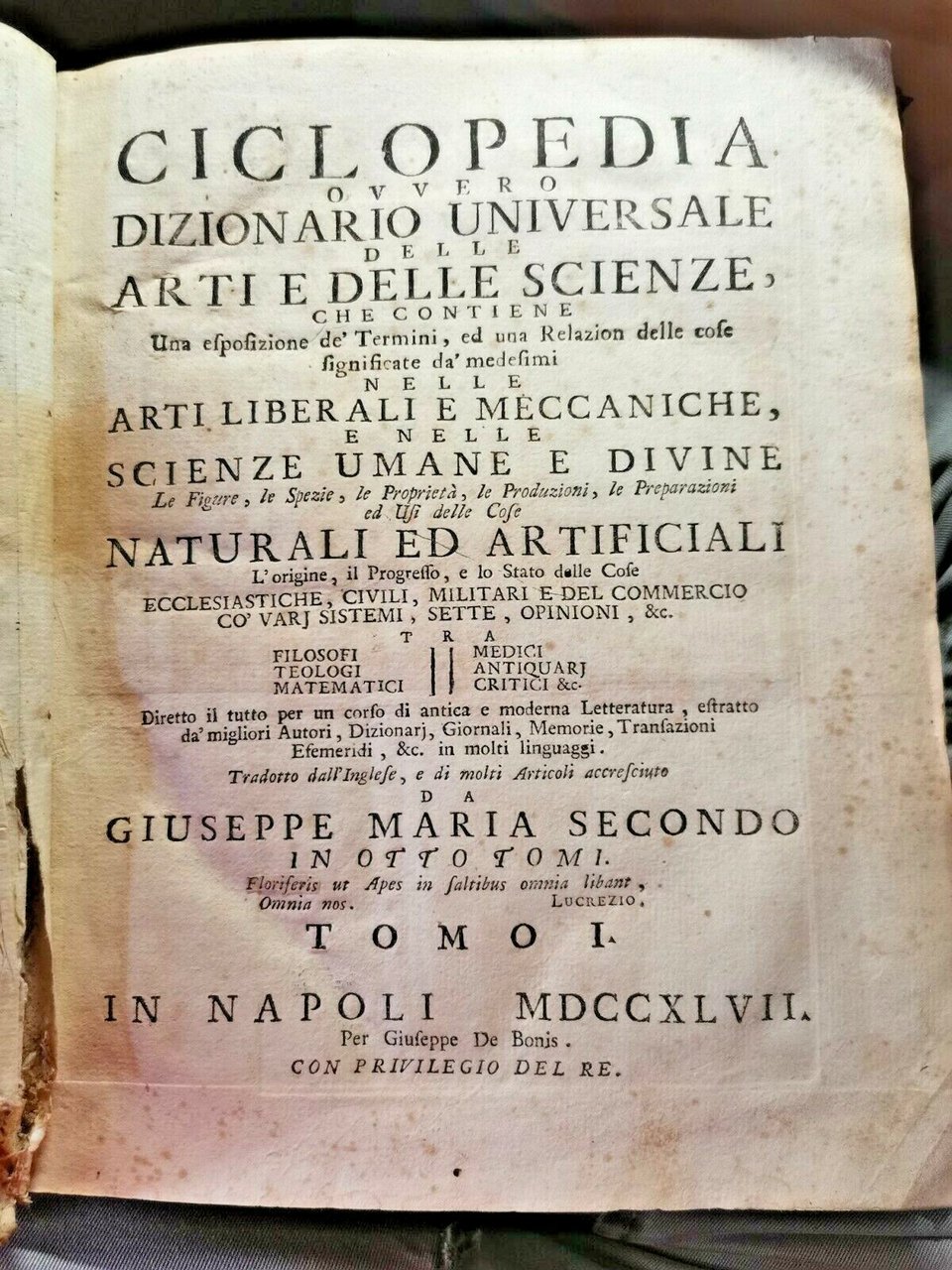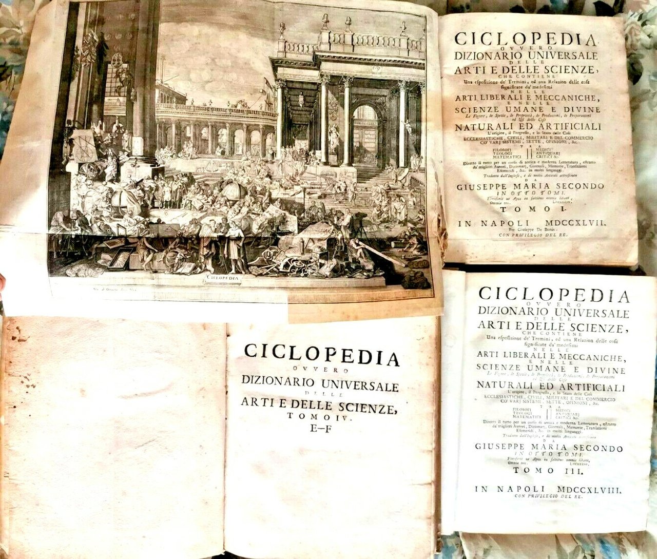 OPERA COMPLETA DI 8 TOMI IN 9 VOLUMI: CICLOPEDIA OVVERO DIZIONARIO UNIVERSALE DELLE ARTI E DELLE SCIENZE CHE CONTIENE UNA ESPOSIZIONE DE' TERMINI, ED UNA RELAZION DELLE COSE SIGNIFICATE DA' MEDESIMI NELLE ARTI LIBERALI E MECCANICHE, E NELLE SCIENZE UMANE E DIVINE... In Napoli, per Giuseppe De Bonis 1747 -1754.