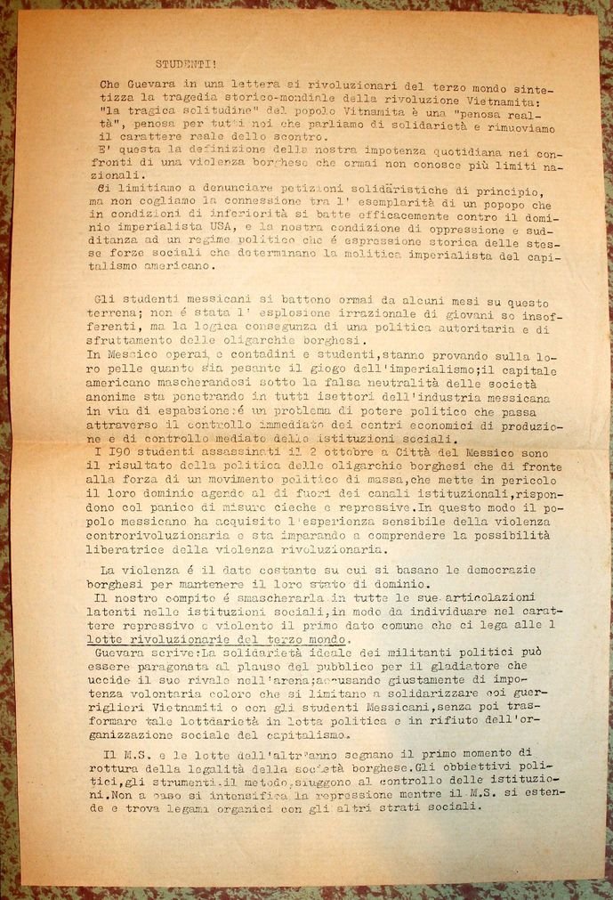 Ciclostilato del Movimento Studentesco rivolto agli studenti. Genova, Ottobre 1968