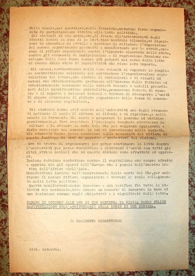 Volantino ciclostilato cm. 33 x 22- Bordi ingialliti. Foglio piegato al centro. Il Movimento Studentesco invita a partecipare alla manifestazione nell'anniversario della morte di Che Guevara. Genova, sabato 12 Ottobre alle ore 16, con partenza in piazza Carlo Felice.