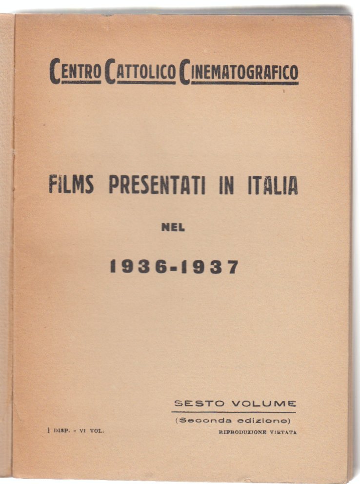 SEGNALAZIONI CINEMATOGRAFICHE 1936-1937 2∞ EDIZ. VOLUME VI CENTRO CATTOLICO CINEMATOGRAFICO COPERTINA FLESSIBILE EDITORIALE CON UNA LIEVISSIMA PIEGA AL PIATTO, DORSO BRUNITO LEGATURA LEGGERMENTE ALLENTATA, INTERNO IN BUONO STATO LIEVE OSSIDAZIONE AI MARGINI DELLE PAGINE, N. PAG. 187 CM. 16 X 11,5. -