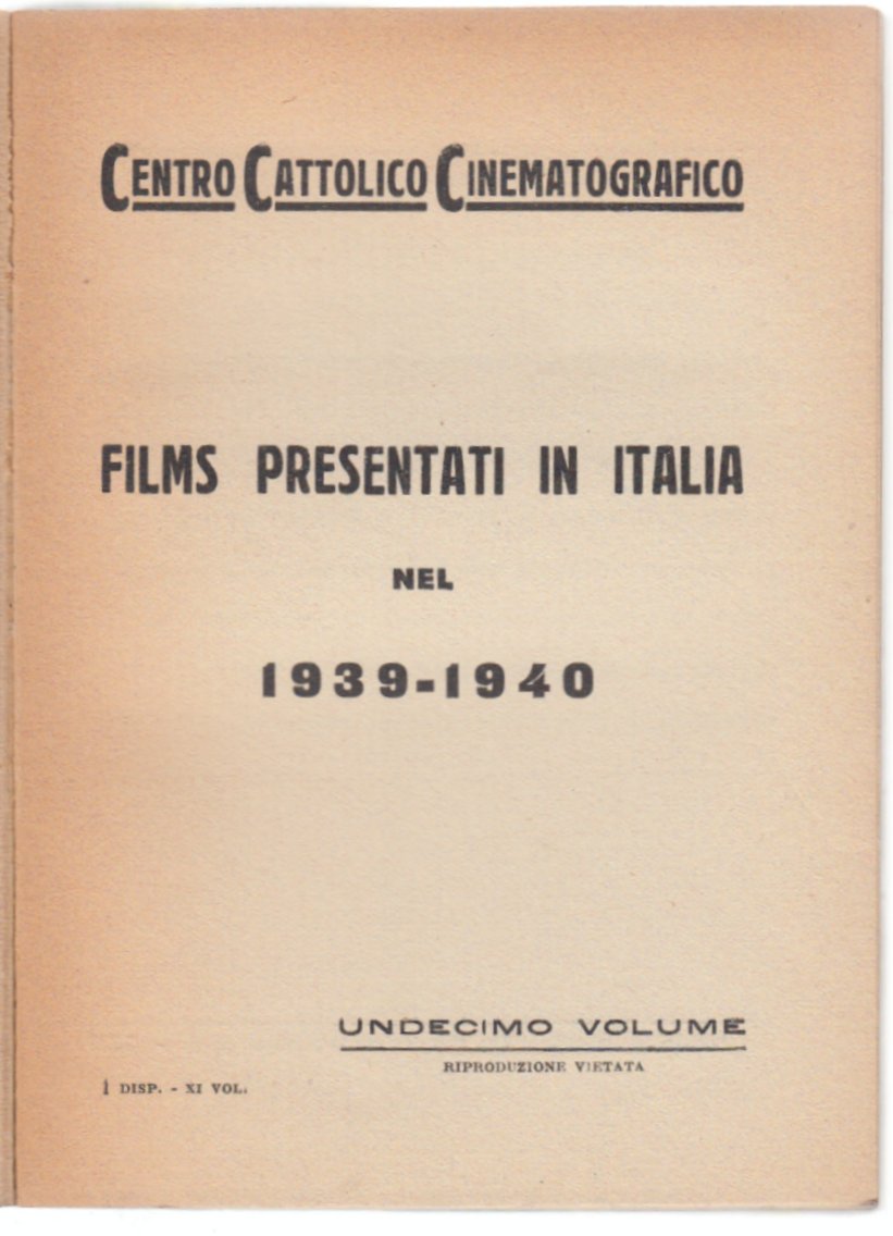 SEGNALAZIONI CINEMATOGRAFICHE 1939-1940 1∞ EDIZ. VOLUME XI CENTRO CATTOLICO CINEMATOGRAFICO COPERTINA FLESSIBILE EDITORIALE CON LIEVI SEGNI DEL TEMPO, DORSO BRUNITO INTERNO IN BUONO STATO LIEVE OSSIDAZIONE AI MARGINI DELLE PAGINE, N. PAG. 188 CM. 16 X 11,5