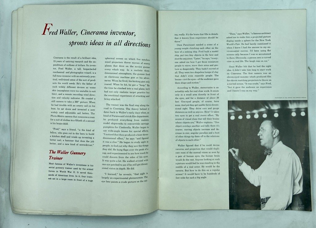Brossura editoriale illustrata, spillato cm 30 x 23, pp (24) illustrate in nero con dettagli grafici in rosso. Testo in inglese. Discreto esemplare, lievi segni d’uso sulla copertina e tenue sentore d’umido. Programma promozionale per «This is cinerama», lo spettacolo inaugurale dell’omonimo sistema inventato da Fred Waller (1886 - 1954) che prevedeva di girare simultaneamente con tre cineprese sincronizzate e quindi proiettare su uno schermo curvo un’immagine molto avvolgente (146 gradi di ampiezza). L’opuscolo presenta l’inventore e altre figure chiave della Cinerama Inc. e della Cinerama Production Corp., in particolare il pioniere dell’elettronica audio Hazard E. Reeves (1906 - 1986) e i cineasti Lowell Thomas e Merian C. Cooper (regista di King Kong), che parteciparono alla produzione del film. Oltre ai dettagli tecnici del Cinerama, l’opuscolo presenta alcuni particolari del film This is Cinerama, in particolare per quel che riguarda la porzione girata al Teatro alla Scala di Milano e quella sulle montagne russe al Rockaway’s Playground. Il Cinerama, sviluppato da Waller a partire da un proprio simile sistema «immersivo» di addestramento per avieri che utilizzava 5 cineprese, fu brevettato nel 1946 e presentato al pubblico nel 1952; in Italia il cinema Manzoni di Milano, e a Roma il Teatro Sistina e il Royal furono le uniche sale che si attrezzarono per questa affascinante e sfortunata tecnologia.