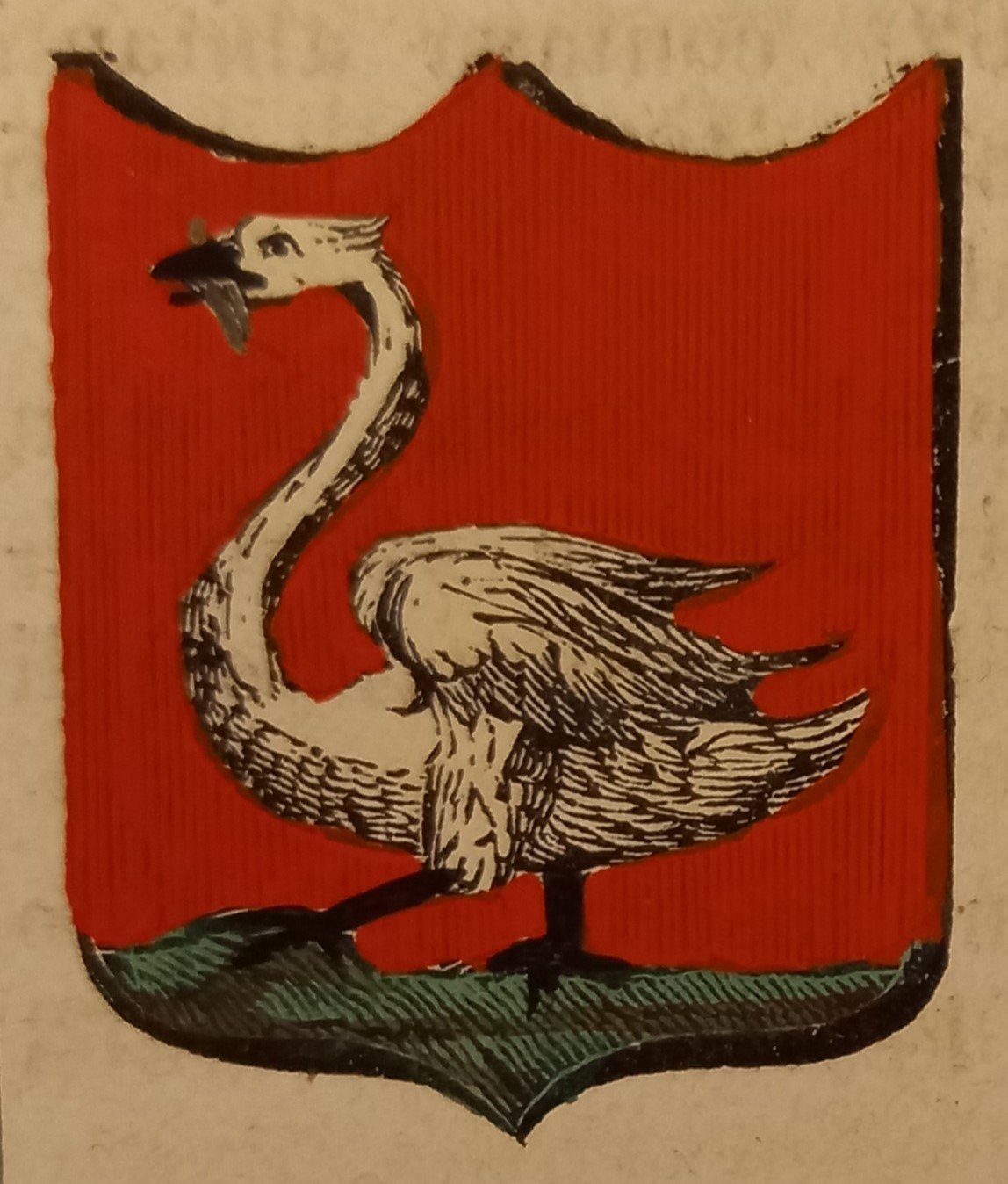 Piccolo stemma comunale colorato a mano d’epoca (cm. 3,8 x 3,2 ca.). Stralcio dal Dizionario Corografico illustrato dell’Italia, edito a Milano nel 1868. Ogni stemma di questa raccolta è inserito in una o più pagine di testo con la descrizione della località, notizie storico - geografiche e statistiche (numero degli abitanti e degli elettori, guarnigioni della Guardia Nazionale, ecc.). Spesso il testo è redatto da studiosi locali o dai sindaci, con maggiori, interessanti notizie.