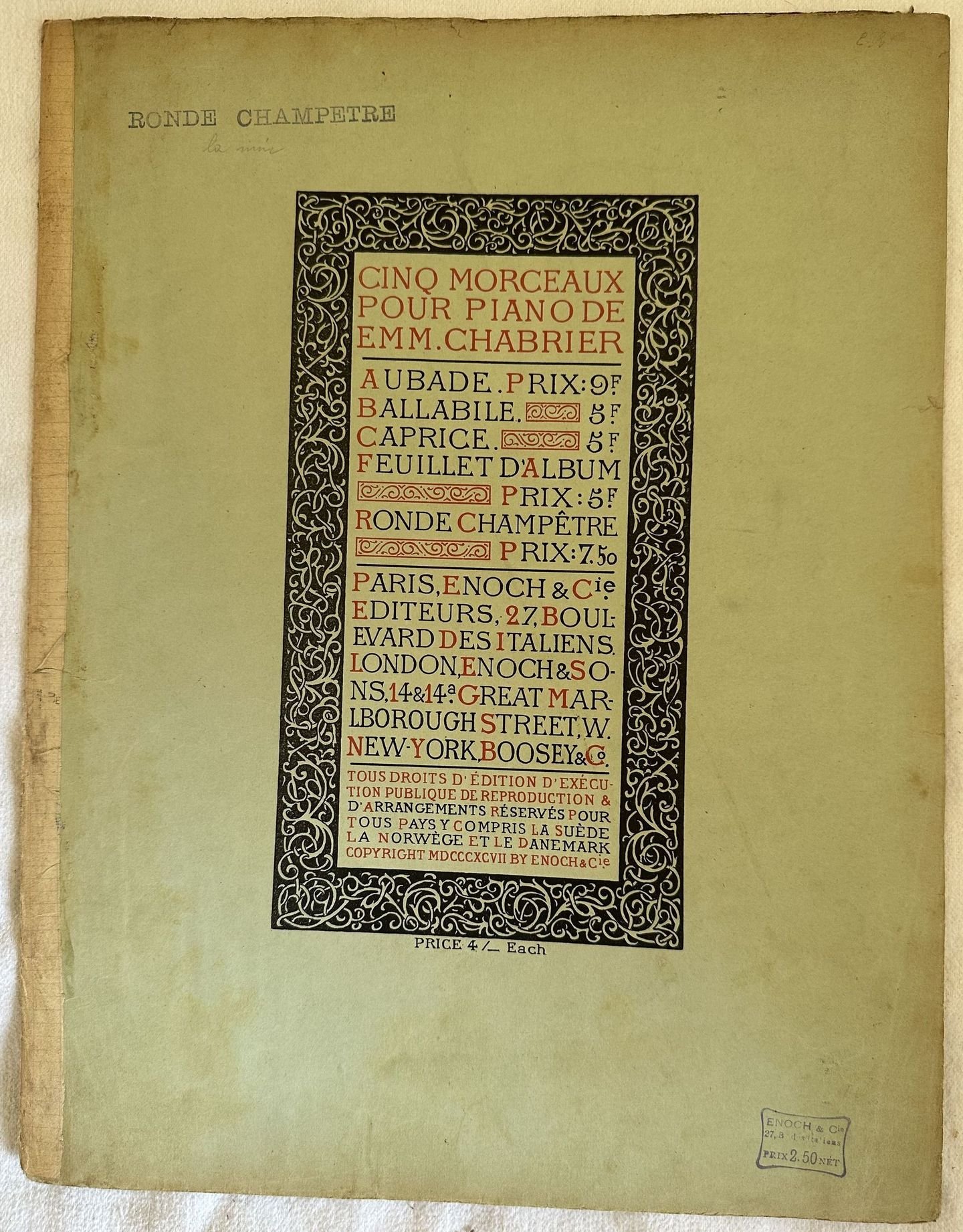 Edizione del 1897 di questo spartito per pianoforte della melodia "Ronde Champetre" di Emmanuel Chabrier (1841-1894) compositore e pianista di epoca romantica. In buone condizioni. Copertina editoriale in buone condizioni con lievi usure marginali. Rinforzo al dorso. Legatura in buone condizioni. Pagine in buone condizioni con rare fioriture. In folio. cm. 35,5x27. Pp. 8. Edition of 1897 of the melody "Ronde Champetre" by Emmanuel Chabrier (1841-1894) composer and pianist of romantic period. In good conditions. Editorial cover in fair conditions lightly worn in the extremities. Reinforcement in the spine. Binding in good conditions. Pages in good conditions with occasional foxing.In folio. cm. 35,5x27. Pp. 8