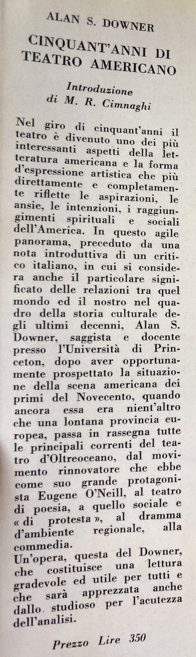 Nel giro di cinquant'anni il teatro è divenuto uno dei più interessanti aspetti della letteratura americana e la forma d'espressione artistica che più direttamente e completamente riflette le aspirazioni, le ansie, le intenzioni, i raggiungimenti spirituali sociali e dell'America. In questo agile panorama, preceduto da una nota introduttiva di un critico italiano, in cui si considera anche il particolare significato delle relazioni tra quel mondo ed il nostro nel quadro della storia culturale degli ultimi decenni, Alan S. Downer, saggista e docente presso l'Università di Princeton, dopo aver opportunamente prospettato la situazione della scena americana dei primi del Novecento, quando ancora essa era nient'altro che una lontana provincia europea, passa in rassegna tutte le principali correnti del teatro d'Oltreoceano, dal movimento rinnovatore che ebbe come suo grande protagonista Eugene O'Neill, al teatro di poesia, a quello sociale e di protesta, al dramma d'ambiente regionale, commedia. Un'opera, questa del Downer, che costituisce una lettura gradevole ed utile per tutti e che sarà apprezzata anche dallo studioso dell'analisi per l'acutezza.