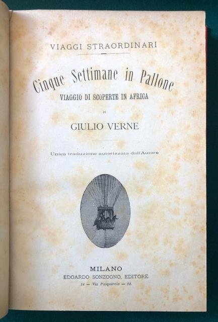 Edoardo Sonzogno Editore, Milano, 1888 / 1889. Collana “Viaggi Straordinari”. Unica traduzione autorizzata dall'Autore. In 8vo grande, due racconti uniti: pp. 267 (con Indice); 460 (con Indice). Moltissime, grandi e belle le incisioni in b/n n. t., che illustrano i racconti con un sapore ancora tutto ottocentesco, leg. coeva ma non orig. in tutta percallina rossa (non conservata la bross. orig.). Uniformemente ingiallito con un po’ di foxing alle prime due pagine (quella bianca e quella del front.) e ad alcune altre pagine nella prima parte, molto buono l'interno.