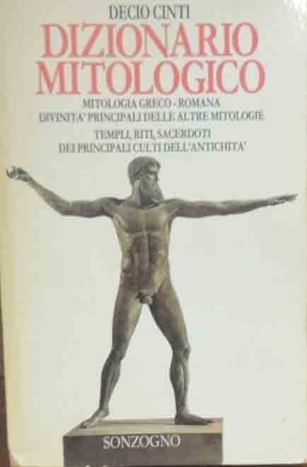 Decio Cinti, Dizionario mitologico. Mitologia greco-romana. Divinità principali delle altre mitologie. Templi, riti, sacerdoti dei principali culti dell’antichità, Sonzogno, s.l. (ma stampato a Bergamo, presso il Nuovo Istituto Italiano d’arti Grafiche) 1994, terza ed., pp. 322, cm 20, br. ed. Leggere tracce d’uso alla brossura, una piccolissima mancanza al dorso, qualche sporadica sottolineatura a evidenziatore, minima ingiallitura della carta, ma nel complesso buona copia.