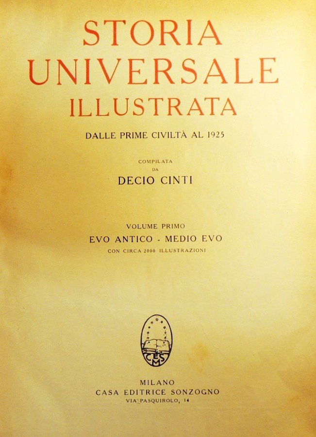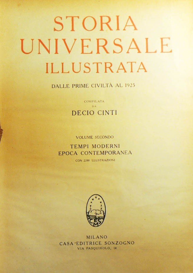 Decio Cinti, Storia universale illustrata dalle prime civiltà al 1925, Casa Editrice Sonzogno, Milano, 1927-28, 2 voll., pp. 2236, ill. b. n., cm 29, elegante mezza tela con titoli e decorazioni al dorso, tagli superiori spruzzati. Volume primo: Evo antico - Medioevo, con circa 2000 illustrazioni. Volume secondo: Tempi moderni - Epoca contemporanea, con 2200 illustrazioni. Lievissime tracce d'uso alle legature. Prime pagine del secondo volume impercettibilmente allentate, con minimo residuo non deturpante di nastro adesivo. Per il resto in buono stato.