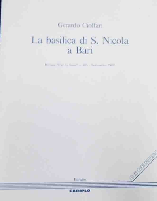 Gerardo Cioffari, La basilica di S. Nicola a Bari, Cariplo – Ca’ de Sas, s.l. 1988, pp. 5, ill. col., cm 28, pubblicazione realizzata in cartoncino. Estratto da Ca’ de sas, n. 103, settembre 1988. Lievissimi segni del tempo, minime tracce d’uso, per il resto ben conservato.