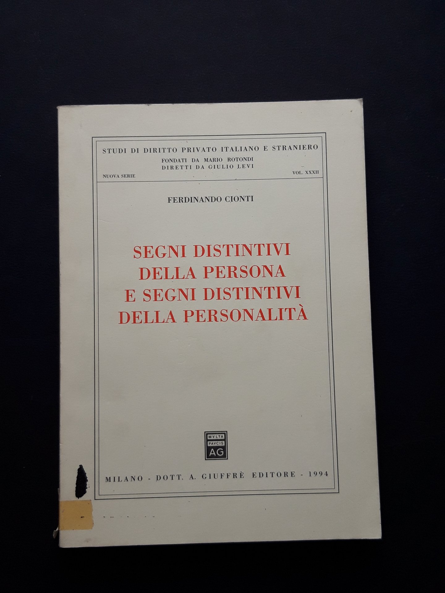 Cionti Ferdinando, Segni distintivi della persona e segni distintivi della personalità, Dott. A. Giuffrè Editore, 1994 - I ed, in 8, Brossura, pp. X + 358, Molto buono.