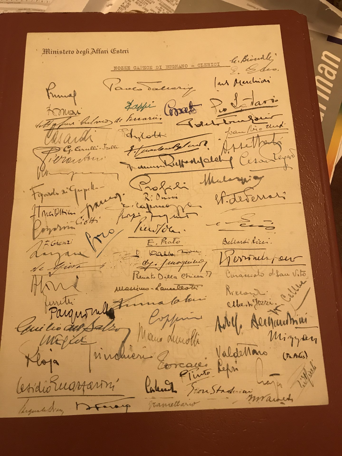 Foglio formato cm. 29x21, intestato "Ministero degli affari esteri", con scritta a macchina "Nozze Capece di Bugnano - Clerici", su cui sono state apposte al recto ed al verso le firme dei partecipanti. Segno di piegatura al centro, ma esemplare molto buono.