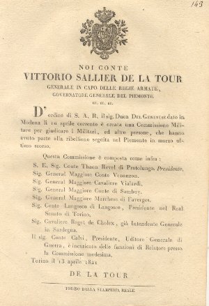 Circolare del Conte Vittorio Sallier de la Tour Generale in Capo delle Regie Armate con la quale, a seguito dell'ordine ricevuto da S.A.R. il sig. Duca del Genevese, crea una Commissione Militare per giudicare i Militari, ed altre persone, che hanno avuto parte della ribellione seguita nel Piemonte in marzo ultimo scorso e nomina i componenti della Commissione medesima. 13 aprile 1821.