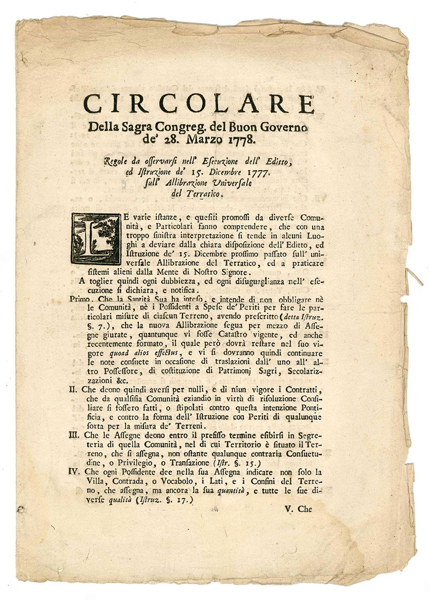 Circolare della Sagra Congreg. del Buon Governo de' 28. Marzo 1778. Regole da osservarsi nell'Esecuzione dell'Editto, ed Istruzione de' 15. Dicembre 1777 sull'Allibrazione Universale del Terratico.