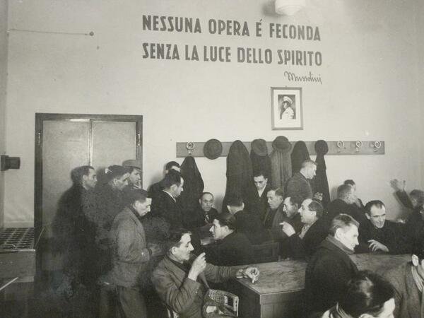 Silver print cm 23 x 17,5. Stampa vintage. La scritta mussoliniana che campeggia sul muro di questo che presumibilmente e' un circolo aziendale, rende l'inquadratura particolarmente ironica. Il tono alto e fortemente retorico si scontra con una realta' composta da giocatori di carte e bevitori che, difficilmente il loro spirito avrebbero usato per le 'opere del regime'.
