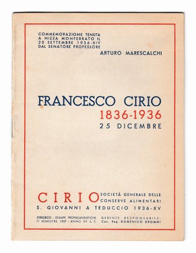 Brossura (cm 19x14,5) pag. 16 con 2 tav. a piena pagina (monumento e foto di Francesco Cirio) -- Commemorazione tenuta a Nizza dal senatore Arturo Marescalchi per il centenario della nascita del fondatore dell'industria di conserve alimentari.