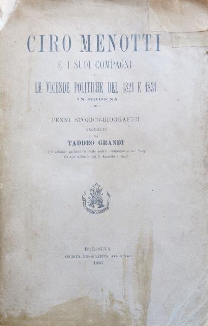 Ciro Menotti e i suoi compagni o le vicende politiche del 1821 e 1831 in Modena. Cenni storico – biografici raccolti da Taddeo Grandi già ufficiale garibaldino nelle patrie campagne e nei Vosgi. Ex sott'Ufficiale del R. Esercito d'Italia.