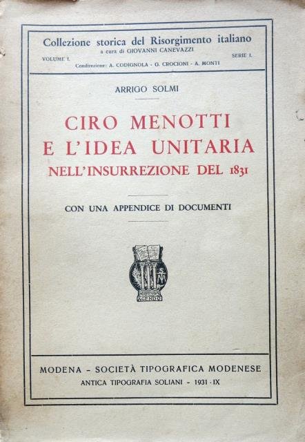 Collezione Storica del Risorgimento italiano a cura di Giovanni Canevazzi. Volume I – Serie 1. Società Tipografica Modenese, Antica Tipografia Soliani, Modena, 1931 – IX. In 4to, pp. VIII (con Prefazione e Indice), 209 (con Indice), bross. edit.in carta. Saggio sui moti rivoluzionari del 1831, con approfondimenti sulla resistenza di Modena e Reggio e con documenti relazioni e lettere riguardanti la figura del patriota Ciro Menotti. Volume scompaginato per mancanze della carta al dorso, leggero uniforme ingiallimento, buono tutto l'interno.