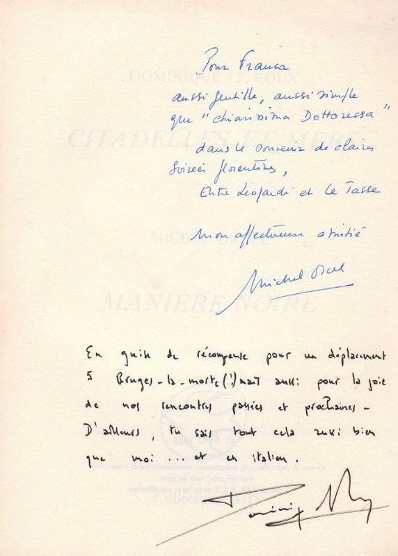 In-16° grande, leg. in brossura editoriale, pp. (6)94(4). Edizione originale di 500 esemplari numerati; il nostro è il n. 016. Alla prima pagina bianca belle dediche autografe firmate di entrambi i poeti. Dominique LE ROUX, altro nome di Dominique SORRENTE, nato a Nevers nel 1953, è un poeta e scrittore francese. Dopo l'infanzia e l'adolescenza trascorse a Marsiglia, studia a Parigi e poi a Bruges scienze economiche e politiche; a partire dal 1979 insegna a Marsiglia. Dopo aver animato l'associazione 'Avalanche' collabora alla 'Revue de Belles-Lettres', 'Obsidiane', 'L'Alphée', 'Sud', e soprattutto 'Lamparo'. Questa è la sua Opera Prima. Michel ORCEL, nato a Marsiglia, è scrittore, editore e psicanalista. Dopo gli studi classici presso i gesuiti dell'Ecole de Provence, studia a Parigi, prima scienze politiche e poi filosofia alla Sorbona. E' stato ricercatore all'Istituto Universitario Europeo di Firenze, e pensionante dell'Accademia di Francia a Roma; esperto di Rinascimento e di Italianistica, ha inoltre fondato all'Università di Rennes una cattedra di Storia dell'Opera Italiana. Della sua opera poetica e critica hanno scritto, tra gli altri, Jean Starobinski (prefazione a 'Langue mortelle'), François Boddaert, Jean-Baptiste Para e Bernard Simeone. Come traduttore ha lavorato all'opera dei grandi italiani (Ariosto, Tasso, Leopardi), contribuendo a rinnovarne gli studi in Francia. Negli ultimi anni lavora ad una nuova traduzione francese della Divina Commedia. Questa è la sua Opera Prima di poesia. Macchiolina al centro del piatto anteriore, ed altre marginali tracce del tempo alla brossura. Ottimo all'interno.