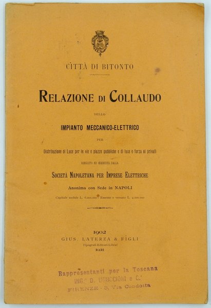 CITTÀ DI BITONTO. RELAZIONE DI COLLAUDO DELLO IMPIANTO MECCANICO-ELETTRICO PER Distribuzione di Luce per le vie e piazze pubbliche e di luce e forza ai privati eseguito ed esercito dalla SOCIETÀ NAPOLETANA PER IMPRESE ELETTRICHE Anonima con Sede in Napoli. 1902 GIUS. LATERZA & FIGLI Tipografi-Editori-Librai BARI.